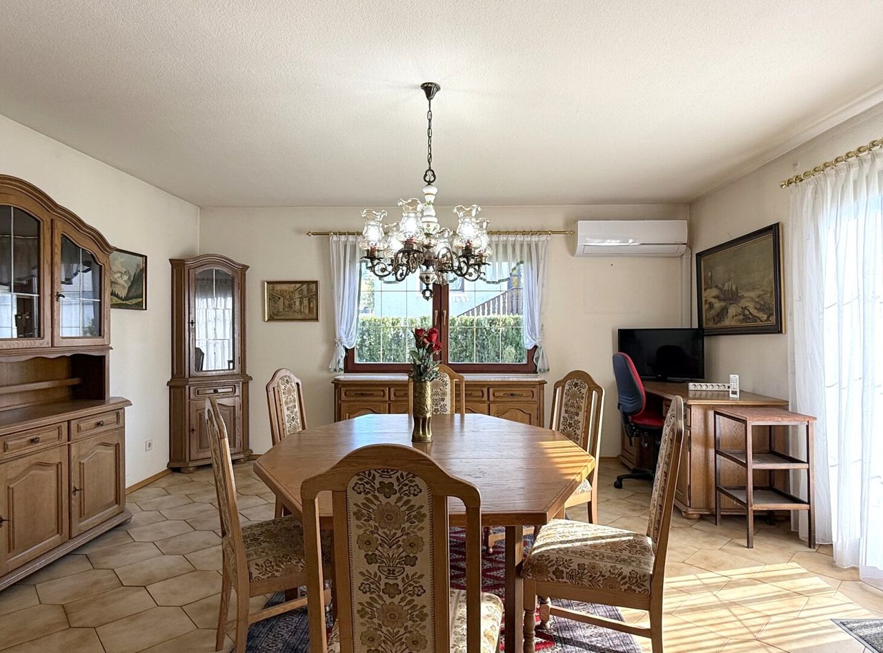 Das 1983 errichtete ELK-Fertigteilhaus bietet eine Wohnfläche von fast 124 m² im Erdgeschoss. Der leicht erhöhte Eingang führt über ein paar Stufen in den Vorraum mit Garderobe – und gleich gegenüber öffnet sich der Wohnbereich: eine offene Küche mit praktischer Speis, angeschlossen an ein großzügiges Esszimmer mit Zugang auf die große Terrasse. Im sogenannten „L-Zwickel“ des Hauses liegt auf der einen Seite das Wohnzimmer, auf der anderen das Esszimmer – mit der Terrasse als sonniger Mitte dazwischen. Im Esszimmer wie auch im Schlafzimmer sorgt eine Klimaanlage für angenehme Temperaturen, wenn die Sommertage einmal heißer werden.