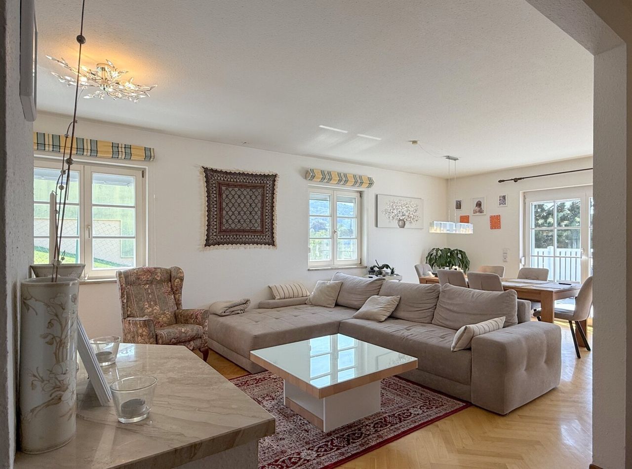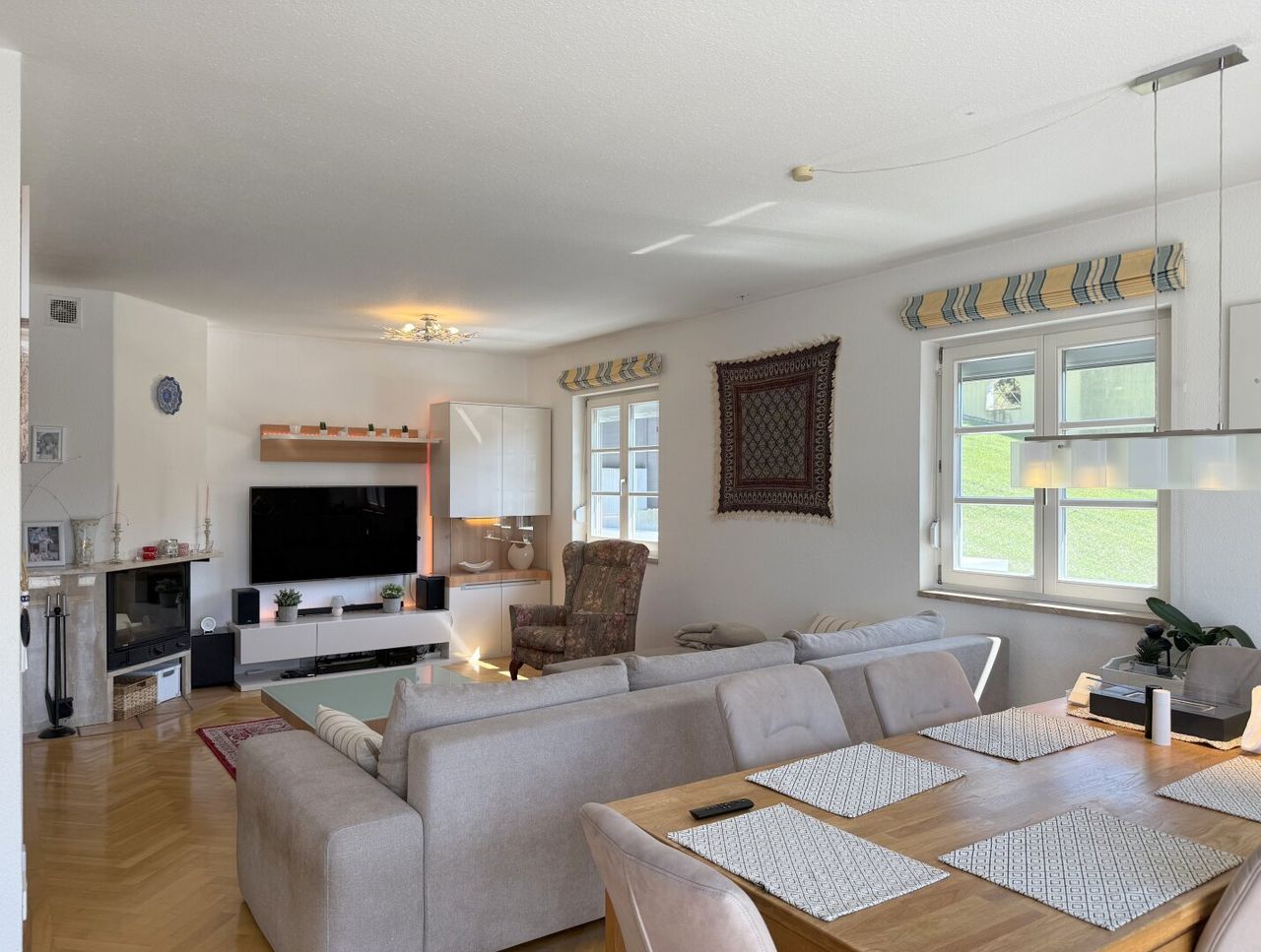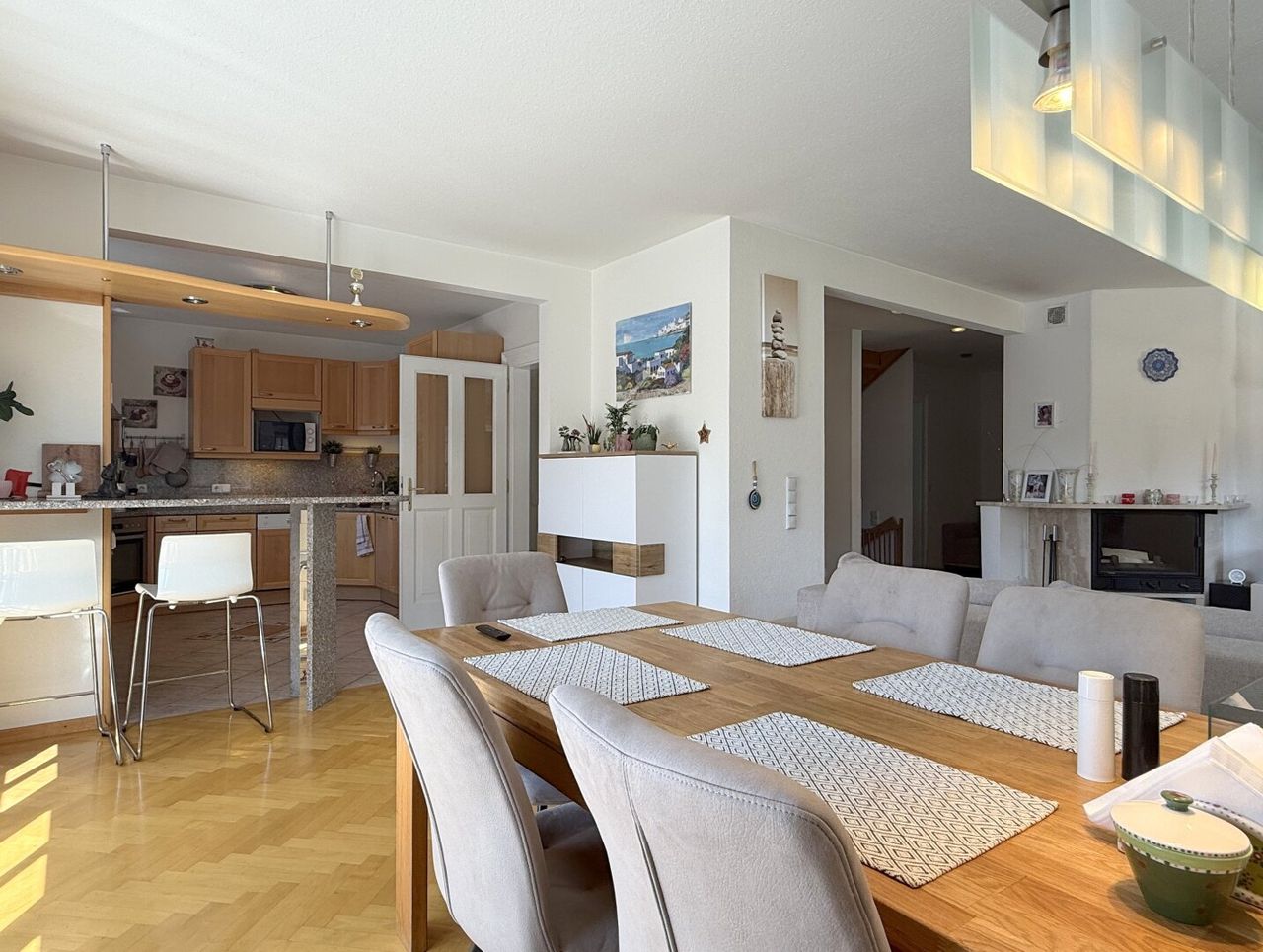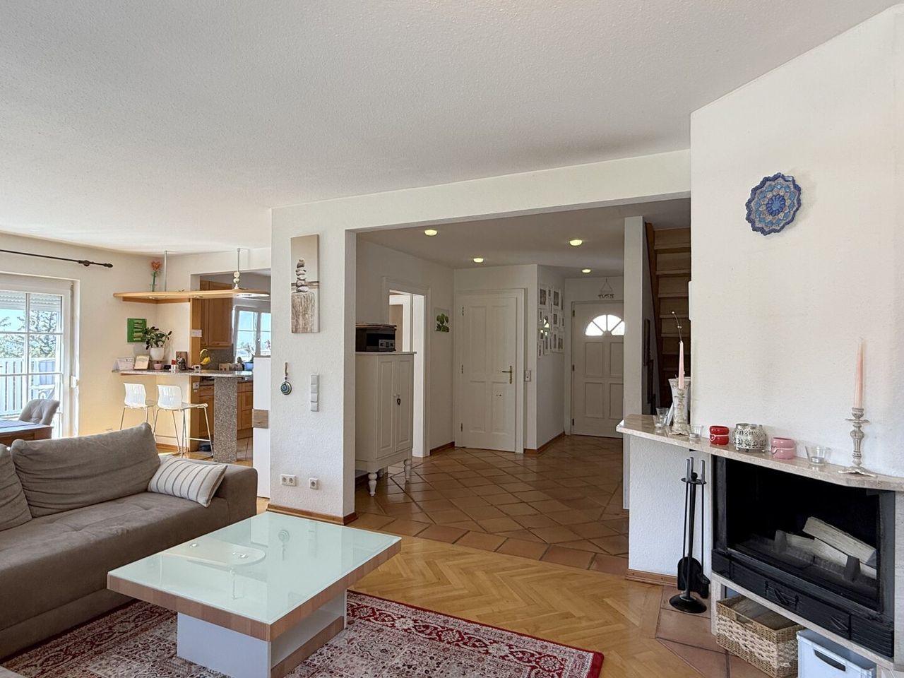 Ein paar Stufen nach oben und man betritt eine große, offene Diele – der perfekte Empfang, der sofort den Blick in den Wohnraum freigibt. Hier öffnet sich das Herz des Hauses: die Wohnlandschaft. Offen, einladend, etwas zurückversetzt – genau richtig, wenn die Familie zusammenkommt. Im Winter knistert der Kamin leise, das Licht tanzt auf dem warmen Echtholzparkett - hier fühlt man sich angekommen, ohne einen einzigen Schritt zu eilen.
