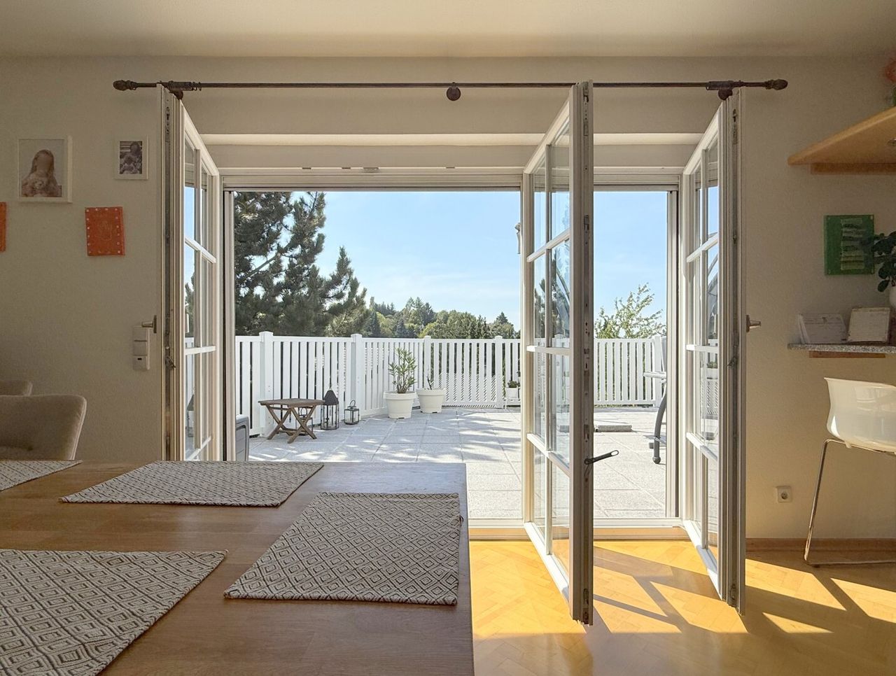 Unweit davon der Esstisch wie bestellt – direkt vor den dreiteiligen Terrassentüren, die sich komplett öffnen lassen. Schon beim ersten Blick lässt der Ausblick erahnen, wie der Tag hier beginnt: mit Licht, Luft und einem Lächeln auf dem Teller.