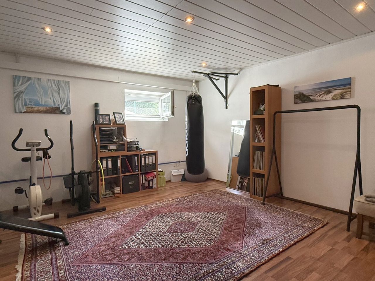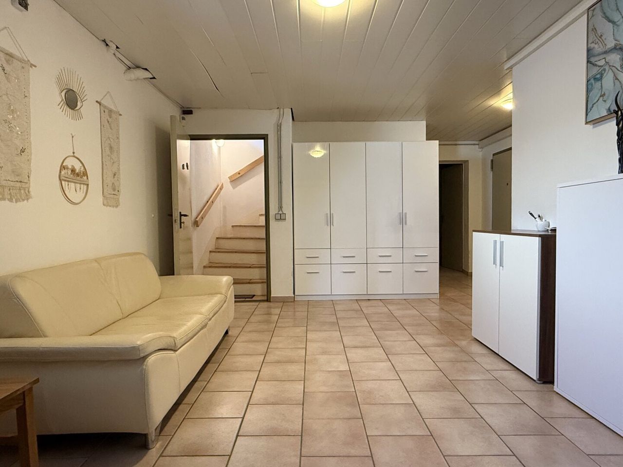 Hell, großzügig, überraschend freundlich – „Kellergefühl“? Kennen wir hier nicht. Der großzügige Eingangsbereich gefliest, aber warm dank Fußbodenheizung. Gleich rechterhand ein Raum mit Fenster: hauseigenes Gym, Atelier, Gästezimmer – oder einfach ein Ort, in dem die Möglichkeiten fast von selbst durch die Luft tanzen.