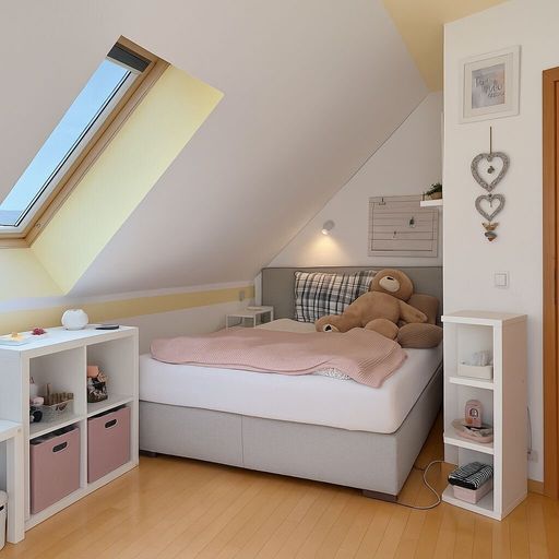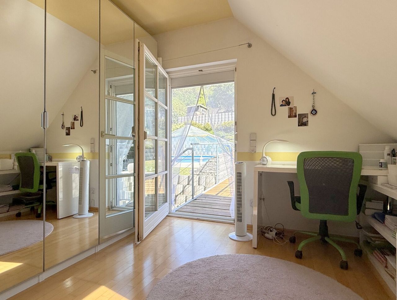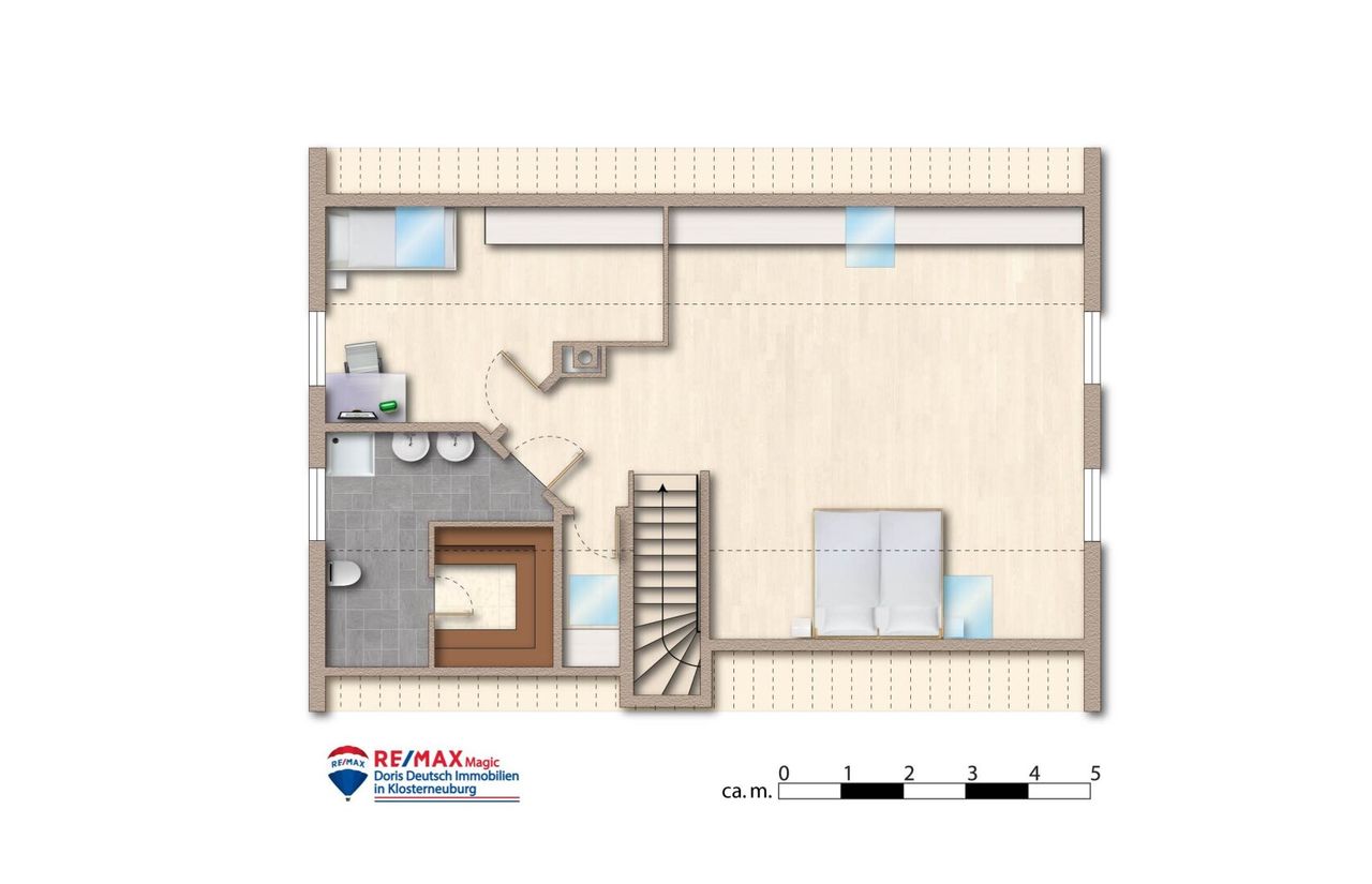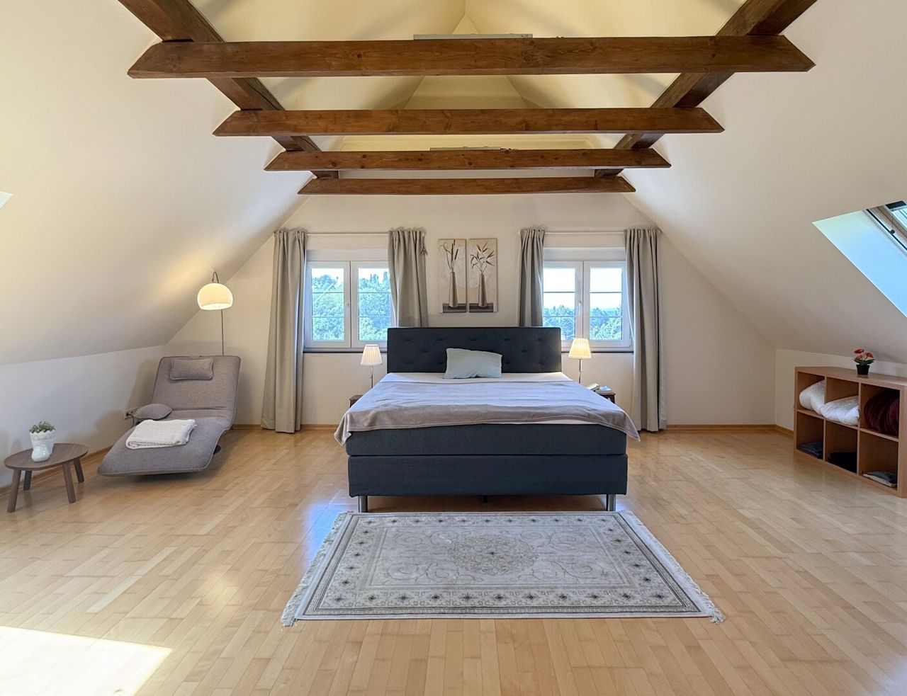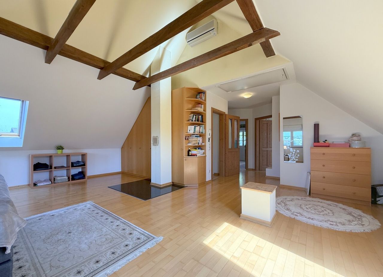 Die Treppe hinauf ins Obergeschoss – schon dann steht man im Masterbedroom. Giebel offen, Balken sichtbar, ein Raum, der atmet, in dem Licht und Schatten miteinander tanzen und die Luft sich leicht und frei anfühlt. Klimatisiert, damit jeder Sommer so angenehm bleibt wie ein Sonnenaufgang, und großzügig genug, dass man die Weite spüren kann, ohne sich zu verlieren. Wer mag, teilt den Raum, wer nicht, genießt ihn für sich allein – ein Rückzugsort, der gleichzeitig inspiriert, träumen lässt und einfach nur gut tut. Dahinter, dezent und fast nebensächlich, liegt das Bad mit Dusche, WC und Sauna, und ein kleines Zimmer führt über ein charmantes Brückerl direkt in den Garten – verspielt, einladend, ein Hauch von Geheimnis.
