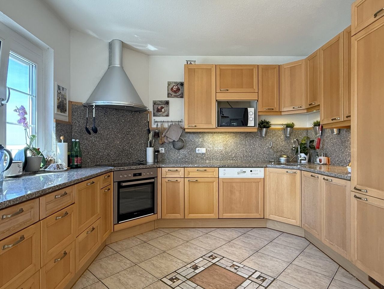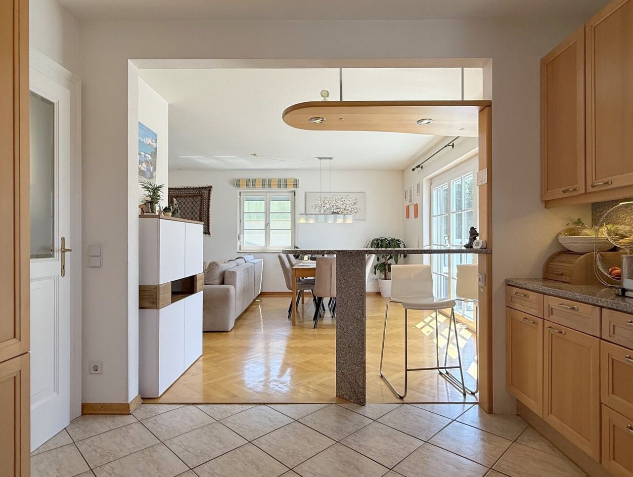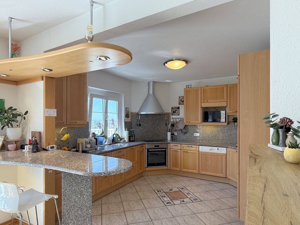 Zurück ins Haus, zur Küche: offen, elegant, mit Granitarbeitsfläche und frisch erneuerten Geräten. Ein Fenster mit unglaublichem Ausblick sorgt dafür, dass man beim Kochen fast vergessen könnte, dass man überhaupt kocht. Eine charmante Frühstücksbar trennt sie dezent vom Wohnbereich, doch nichts hält einen auf – Plaudern, Kochen, Lachen, alles gleichzeitig.