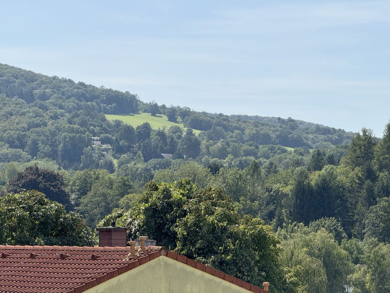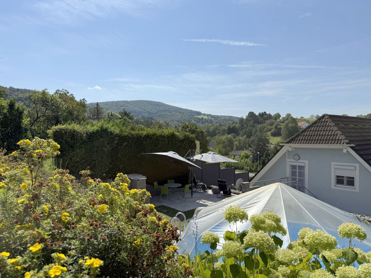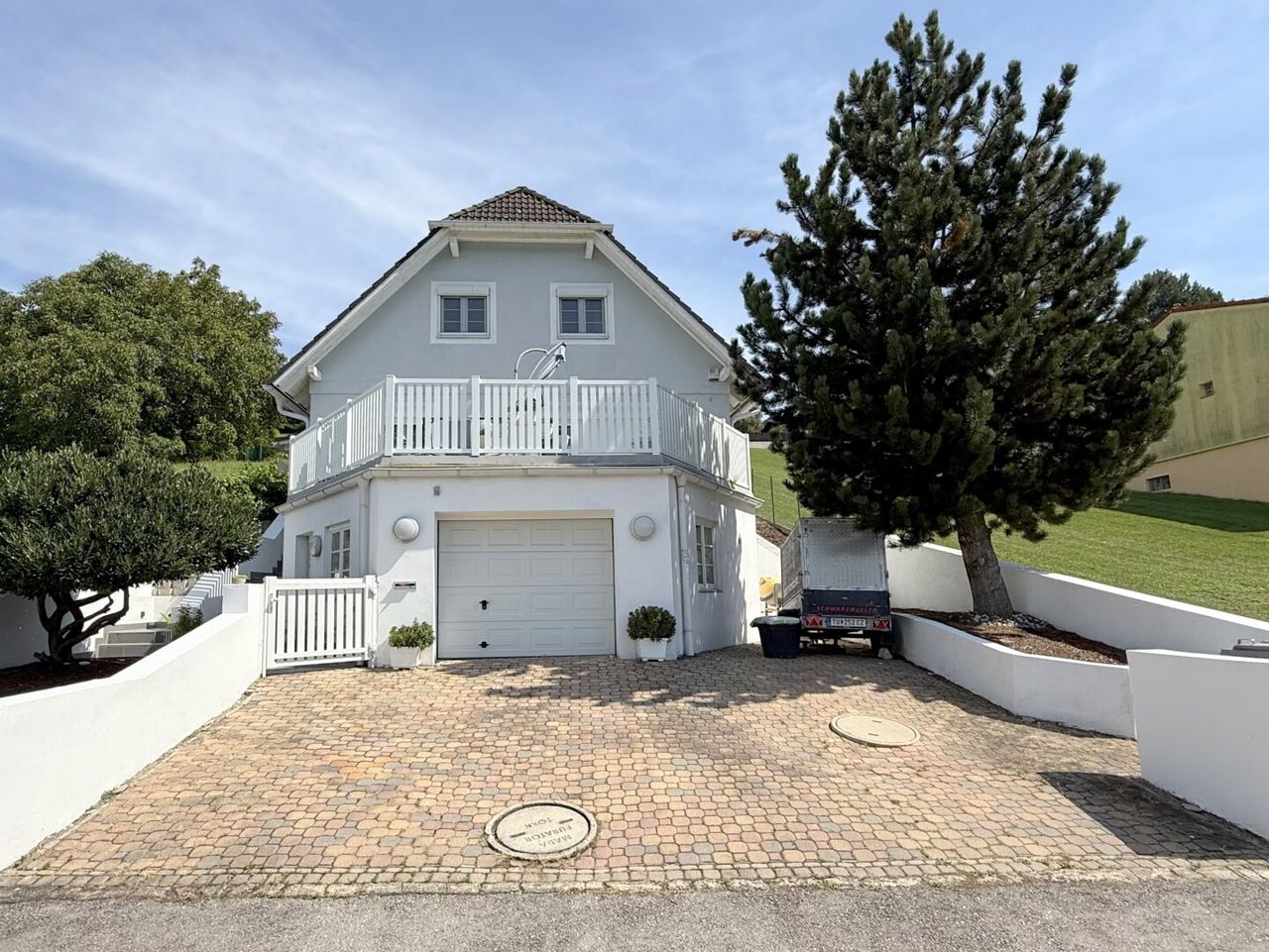 Es gibt Häuser, die stehen brav da, und dann gibt es Häuser, die drängen sich gleich ins Bild. Dieses Fertigteilhaus aus 1995 gehört eindeutig zur zweiten Sorte. Hoch oben am Hang von Königstetten, fast wie auf Zehenspitzen balancierend, steht es da – mit gepflasterter Auffahrt, weißen Zaunlatten, flankiert von zwei Bäumen. In der Sackgasse endet die Straße, der Verkehr bleibt draußen, nur die Aussicht beginnt hier.