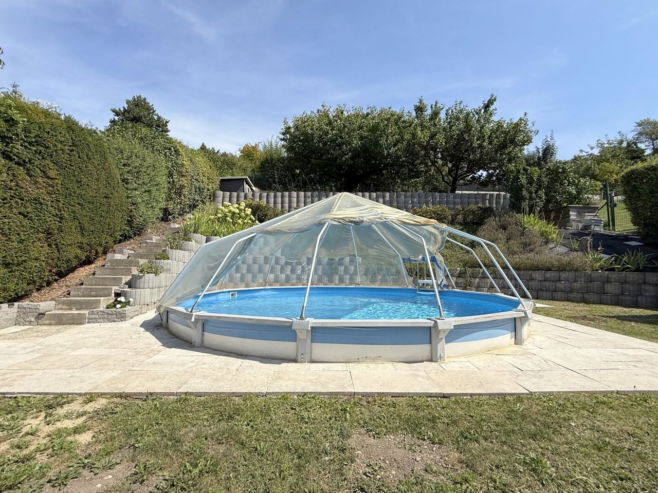 Unten glitzert der Pool in der Sonne, die Terrasse aus Travertin lädt zum Verweilen ein, eine Solardusche kitzelt sanft die Sinne, und Privatsphäre ist hier selbstverständlich.