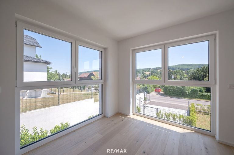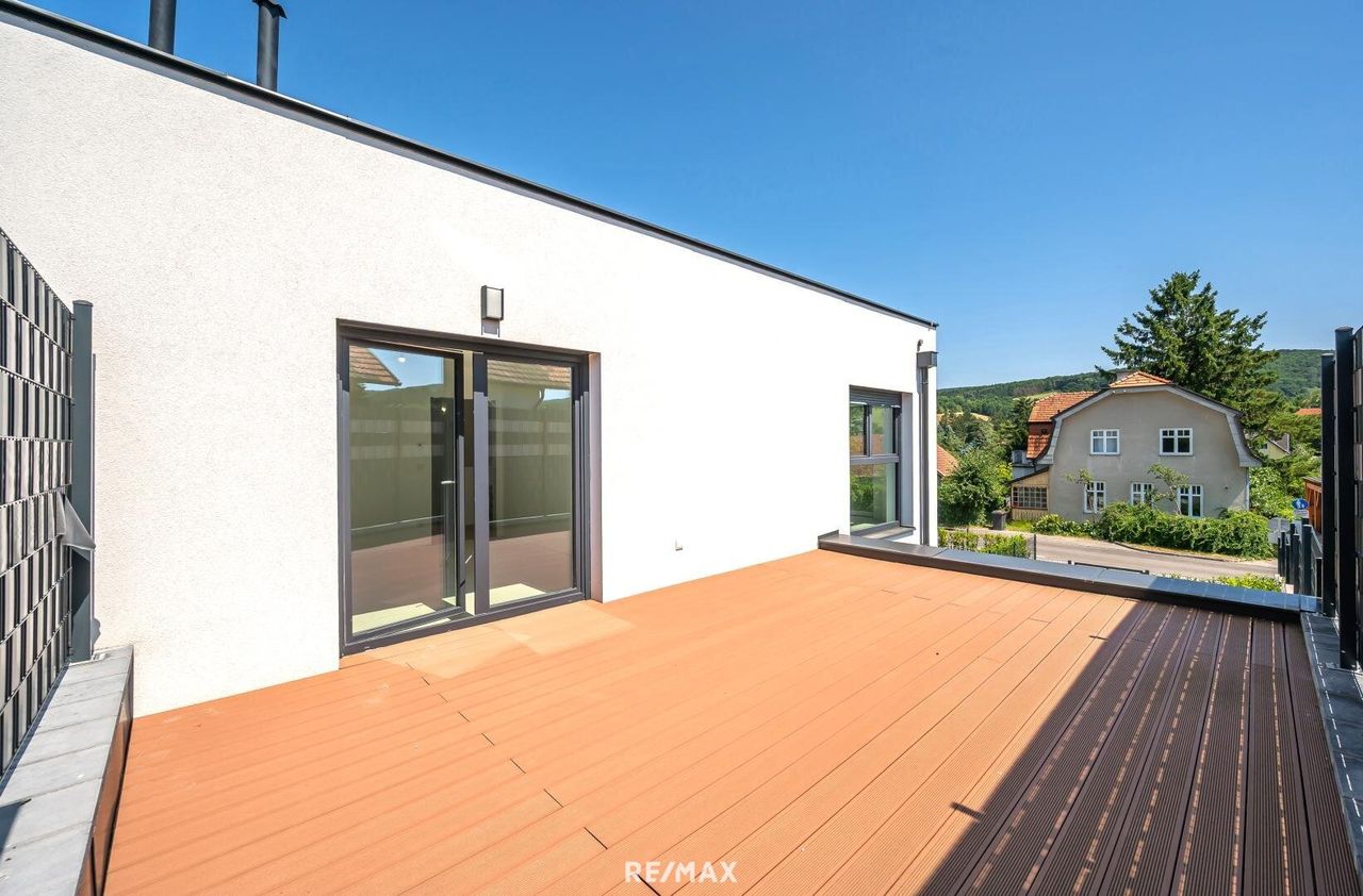 Im Obergeschoß erwarten Sie drei ruhige Schlafzimmer und ein großzügiges Badezimmer mit Fenster, das Tageslicht in Ihr Morgenritual bringt. Ein besonderes Highlight ist die großzügige Terrasse mit unverbaubarem Fernblick über die sanften Hügel des Wienerwalds – ein täglicher Luxus, der inspiriert und entschleunigt.