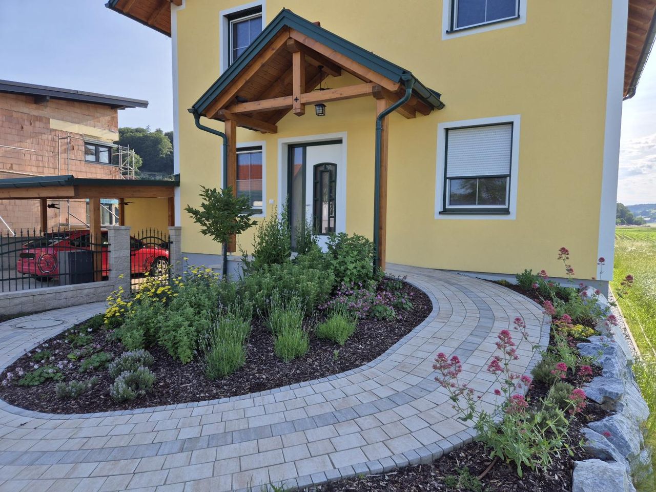Garten: pflegeleichter, ebener Garten mit Tropfschlauchbewässerung, barrierefreie Auffahrt zur Eingangstür durch den Vorgarten