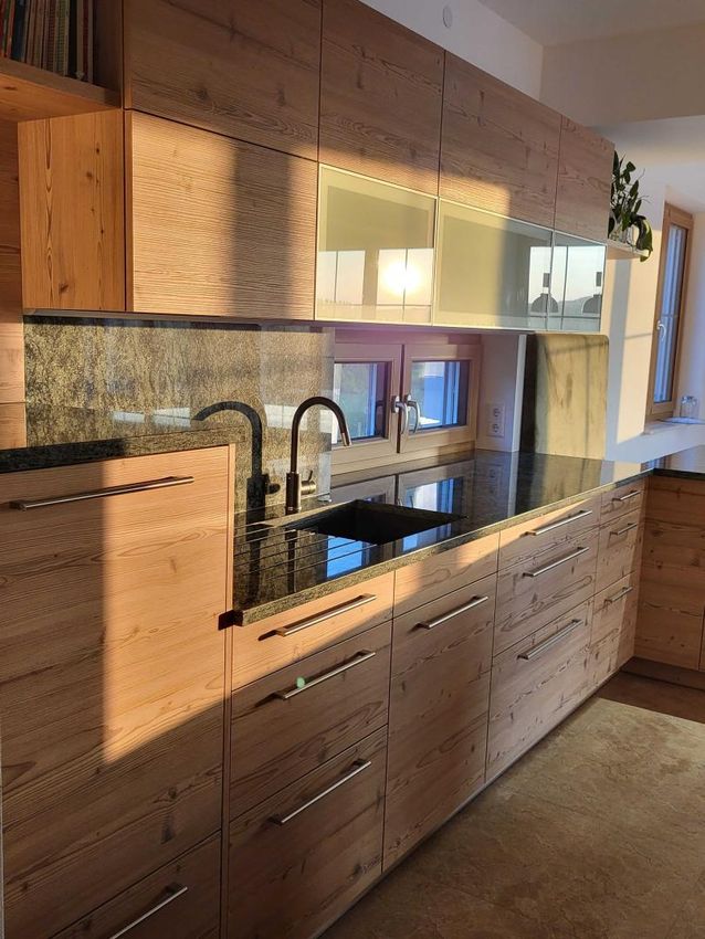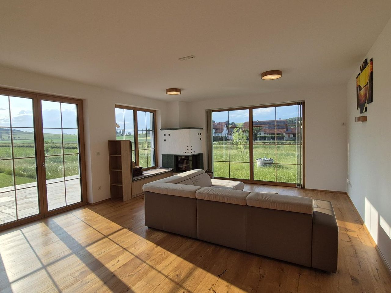 Im lichtdurchfluteten Wohnzimmer sorgt ein schöner Kachelofen für zusätzliche Gemütlichkeit und vom anschließenden Sitzfenster lassen sich malerische Sonnenuntergänge beobachten. Die hochwertige Dan Einbauküche ist mit Markengeräten von Bosch und einer Arbeitsplatte aus Stein ausgestattet. Der voll ausgebaute Keller bietet nicht nur zusätzlichen Stauraum, sondern kann auch für Wohnzwecke und Hobbies genutzt werden.