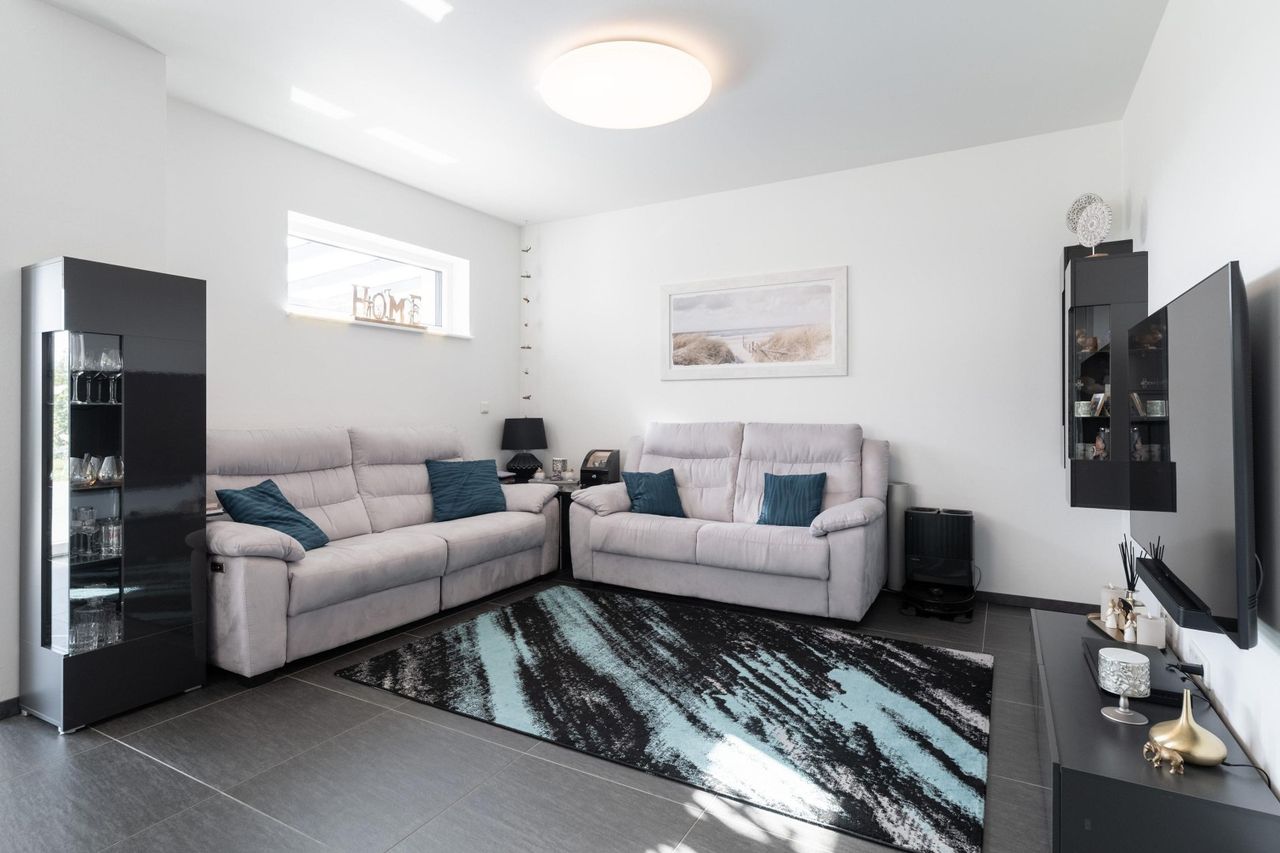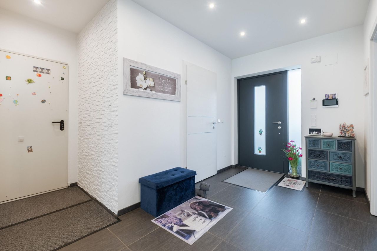 Auch technisch überzeugt das Haus auf ganzer Linie: Photovoltaikanlage (7 kWp) mit 10 kWh Speicher, Wärmepumpe mit Fußbodenheizung, dreifach verglaste Fenster, Außenjalousien, Fliegengitter, Alarmanlage mit Kameras sowie eine Haustür mit Fingerabdrucksensor sorgen für Komfort, Sicherheit und Energieeffizienz. Zusätzlich ist ein Kaminanschluss vorhanden, sodass bei Bedarf auch ein Kaminofen problemlos installiert werden kann.