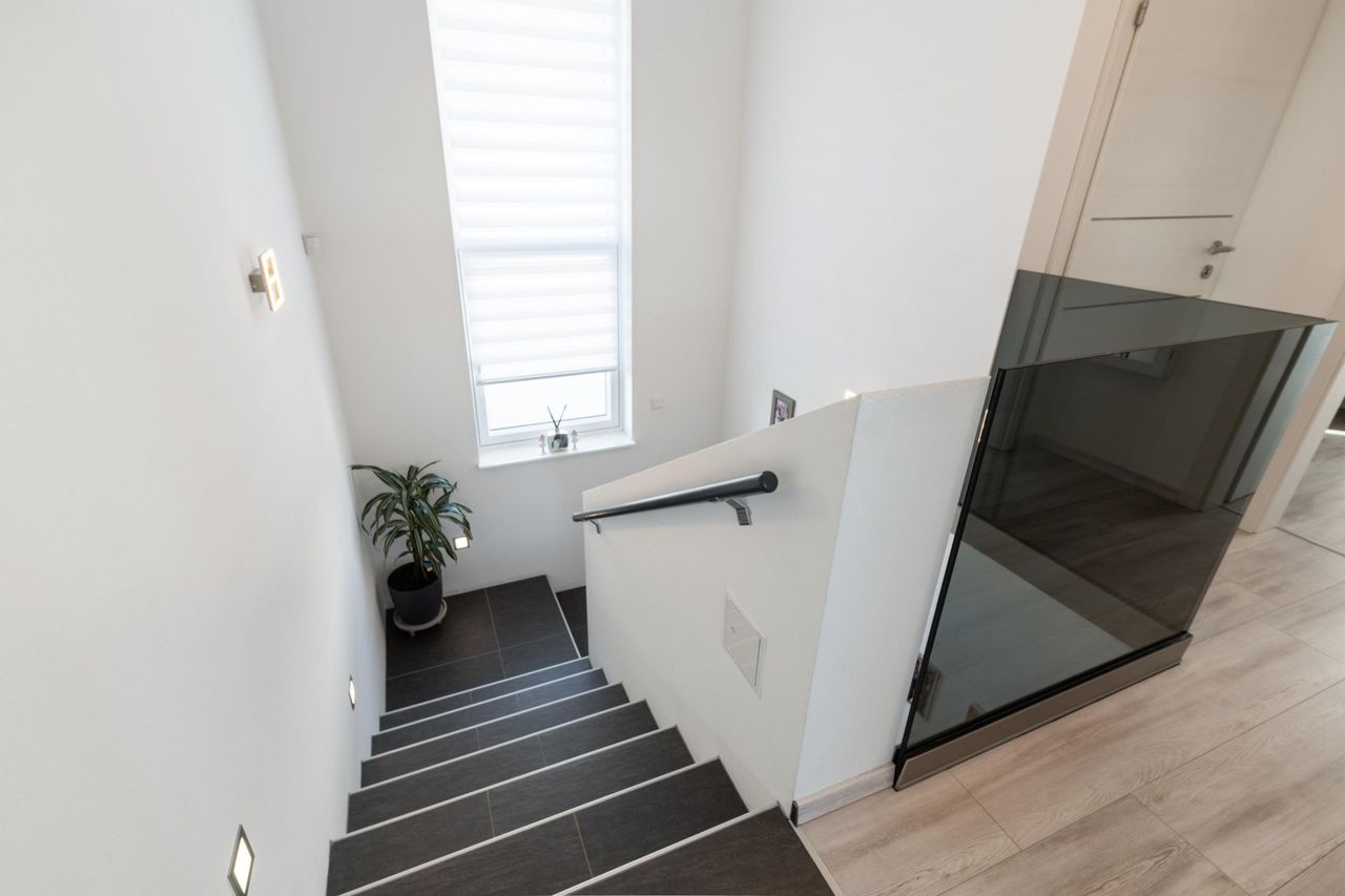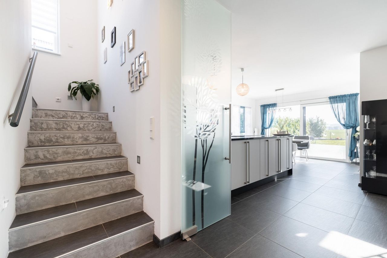 Bereits beim Betreten des Hauses empfängt Sie ein großzügiger Vorraum, von dem aus alle Bereiche des Hauses zentral erreichbar sind das Erdgeschoss, das Obergeschoss, der vollunterkellerte Bereich sowie die Doppelgarage. Eine elegante Glastür verbindet den Vorraum mit dem Herzstück des Hauses: der lichtdurchfluteten Wohnküche.