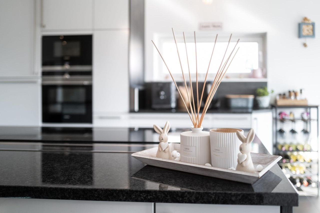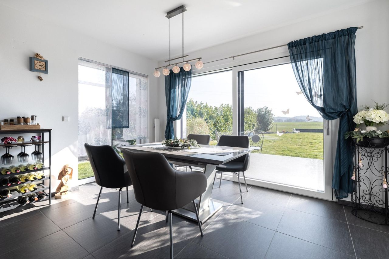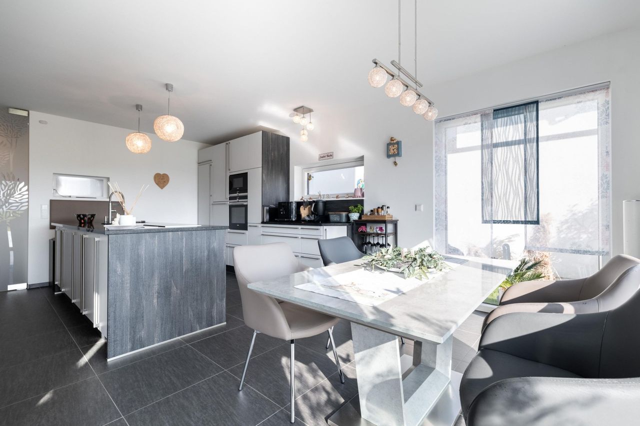 Große Fensterfronten und eine Schiebetür zur Terrasse schaffen eine beeindruckende Verbindung zwischen Innen- und Außenbereich. Der Blick in den südlich ausgerichteten Garten mit freiem Blick ist einfach traumhaft und sorgt für ein besonders angenehmes Wohngefühl. Die moderne Küche überzeugt mit hochwertiger Ausstattung und einer edlen Steinmetz-Arbeitsplatte.