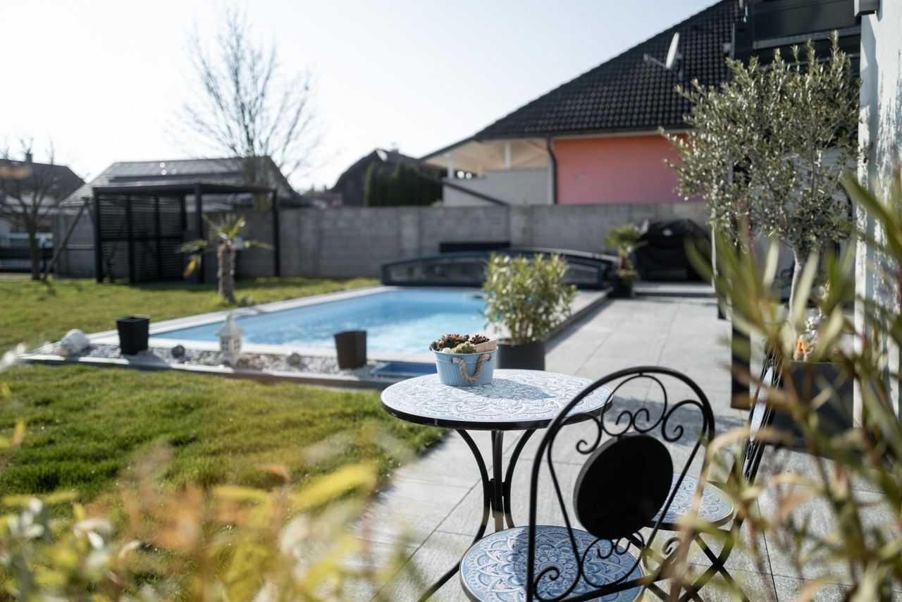 Der Pool mit hochwertiger Überdachung sorgt an warmen Tagen für perfekten Badespaß. Ein gepflegter Garten mit Rasenroboter, praktischem Abstellraum, einem zusätzlichen Pavillon mit gemütlichen überdachten Sitzbereich rundet dieses Gartenparadies perfekt ab.