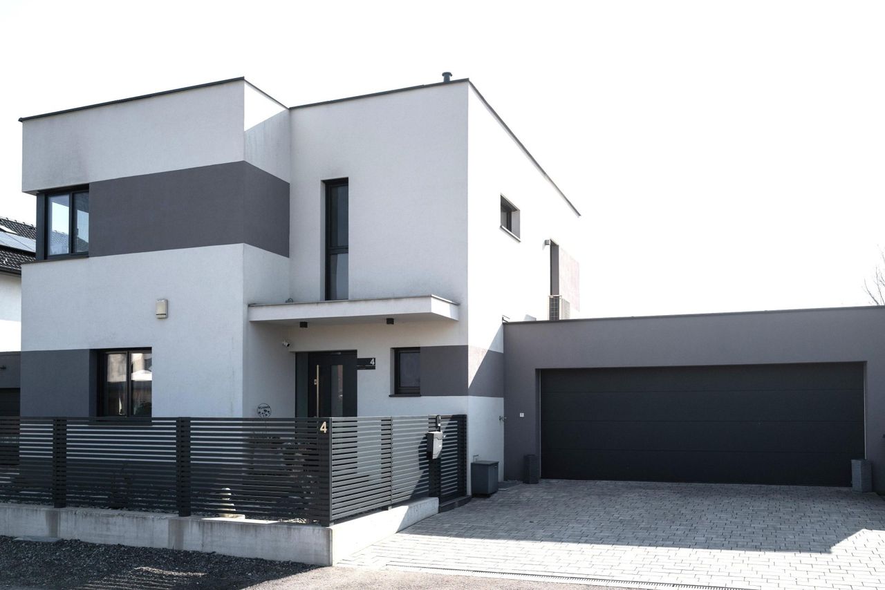 Im Erdgeschoss befinden sich außerdem ein Büro bzw. Gästezimmer, ein Badezimmer mit Dusche und WC sowie der direkte Zugang zur großzügigen Doppelgarage (ca. 44 m²).Vor der Garage stehen in der Einfahrt zusätzlich zwei weitere Stellplätze zur Verfügung.