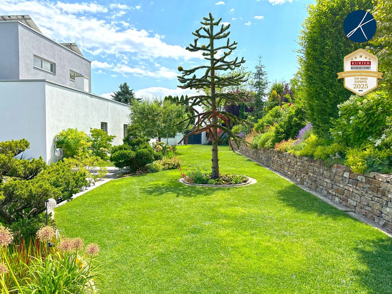 Im Jahr 2005 wurde auf knapp 3.000m² Grundstücksfläche der Südtrakt dieses modernen Traumhauses errichtet und 2009 um einen umfangreichen Zubau (Nordtrakt) samt Keller erweitert. Beide Trakte sind intern verbunden, verfügen aber auch jeweils über einen separaten Eingang und je eine eigene Doppelgarage.