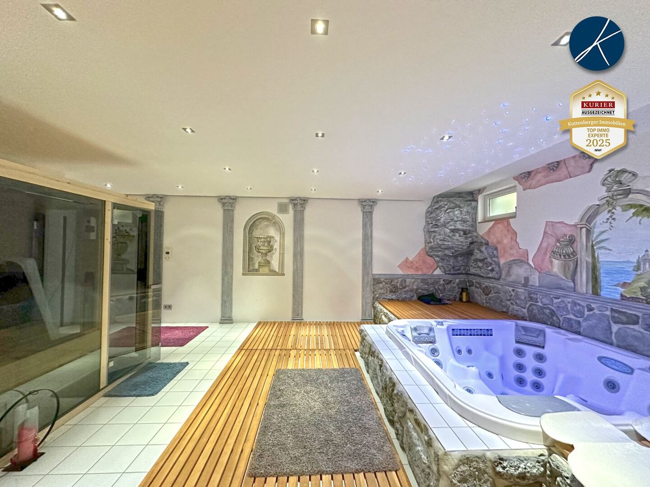 Der rund 201m² große Kellerbereich beinhaltet neben der Haustechnik auch 2 geräumige Gästezimmer mit jeweils eigenem Badezimmer sowie eine kleine Wellness-Oase mit Whirlpool und Liegeflächen. Hier wäre auch genug auch Platz für eine Infratotkabine bzw. Sauna.