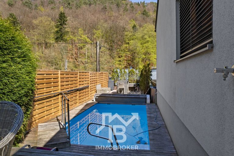 Das Herzstück des Außenbereichs ist der beheizbare Pool, der nahtlos in das architektonische Gesamtkonzept integriert wurde.