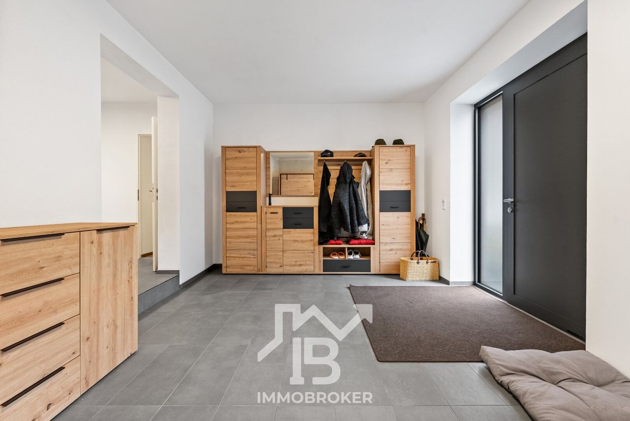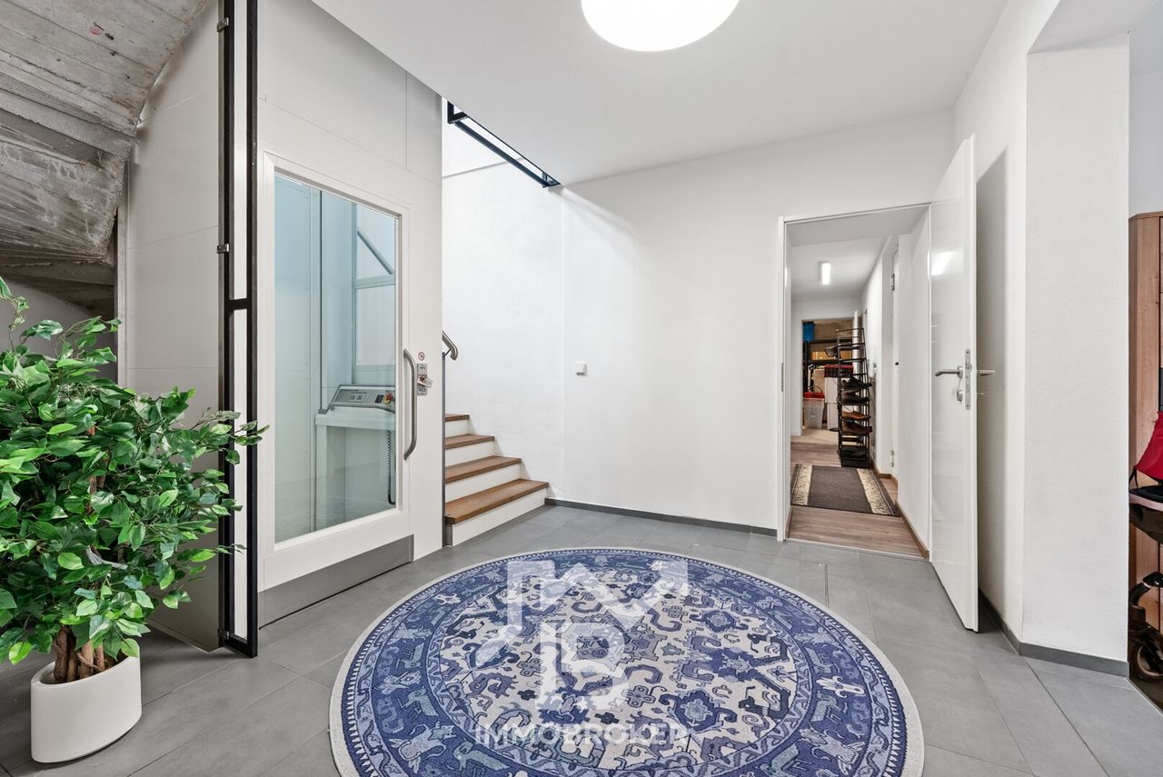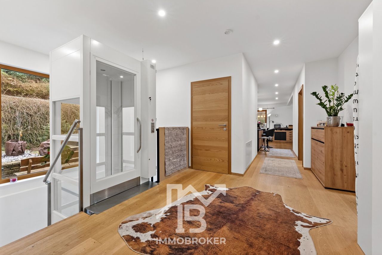 Ein besonderes Highlight ist der integrierte Personenaufzug, der sämtliche Ebenen komfortabel verbindet. So gelangen Sie nicht nur barrierefrei, sondern auch besonders bequem ins Obergeschoss – ein klares Statement für nachhaltige Wohnqualität und Zukunftssicherheit.