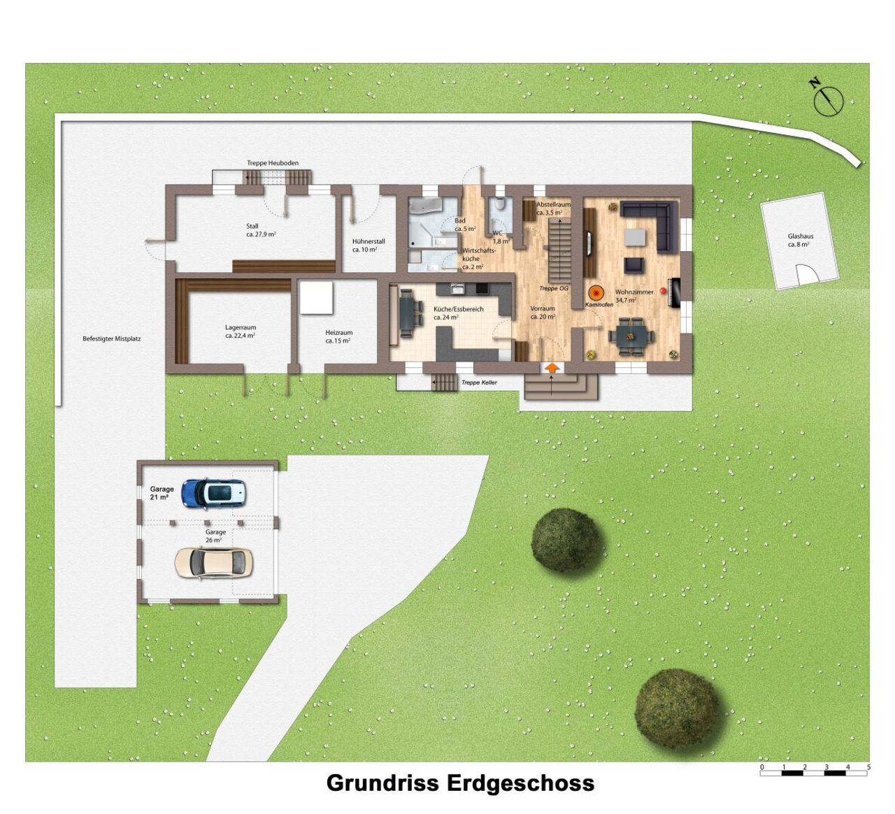 Das über 1 ha große, zusammenhängende Grundstück liegt idyllisch und nahezu uneinsichtig mitten im Grünen – ideal für Tierliebhaber, Pferdehalter oder Direktvermarkter. In der Mitte befindet sich das Wohnhaus, wodurch alle Flächen optimal genutzt und eingesehen werden können.