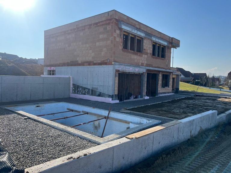 Daneben werden auch 2 Doppelhäuser gebaut mit Pool, Doppelcarport, 127 m2 Wohnfläche, Fertigstellung Ende September 2026.