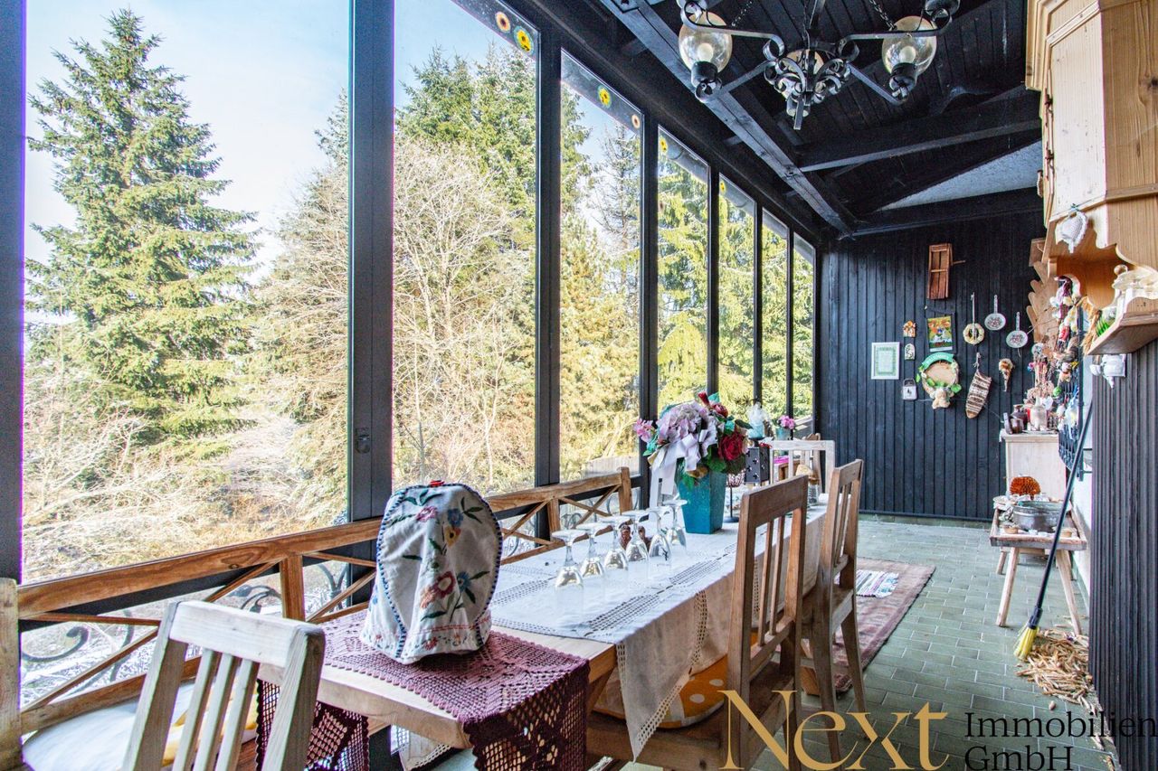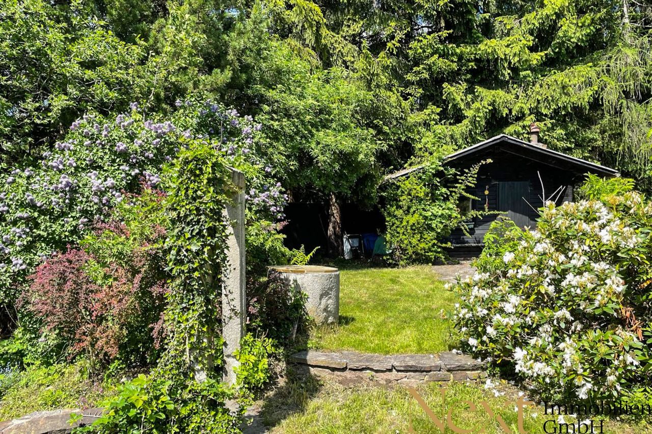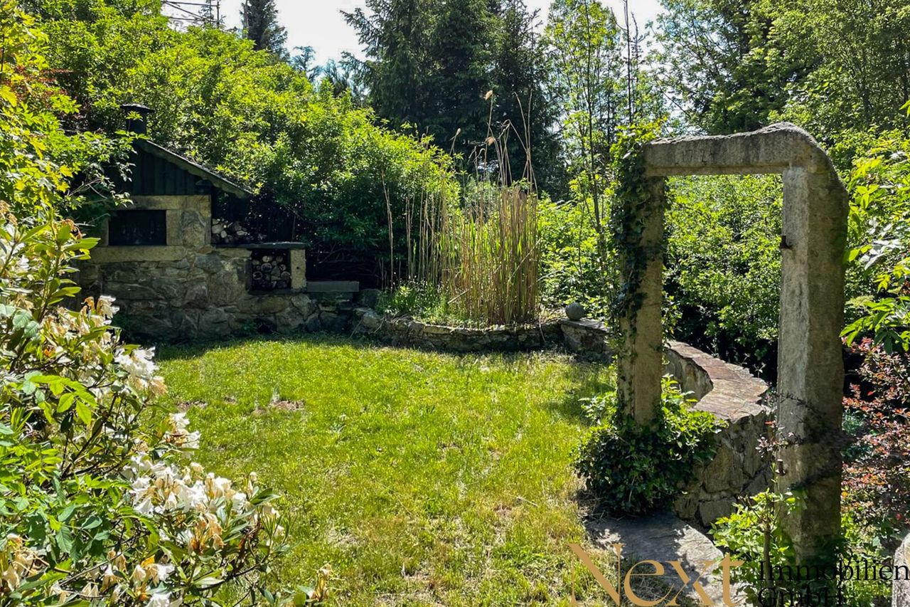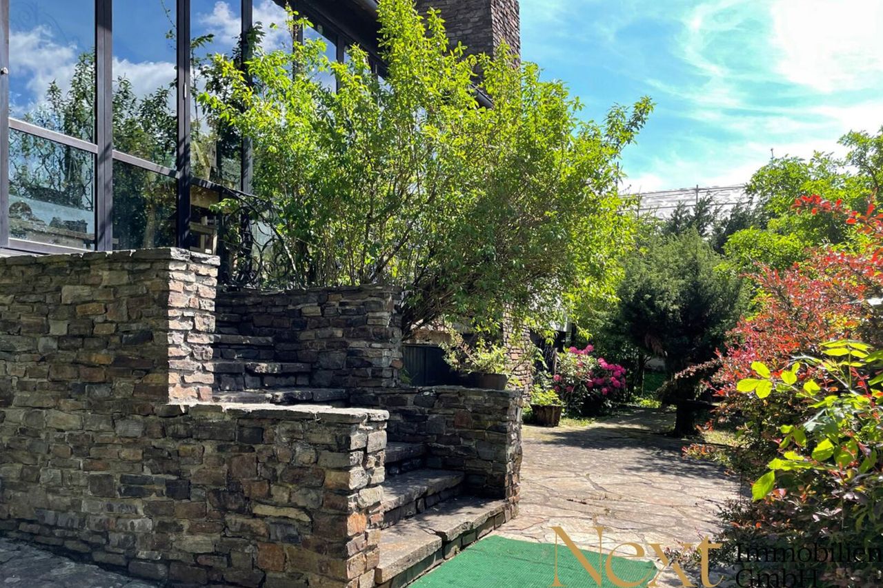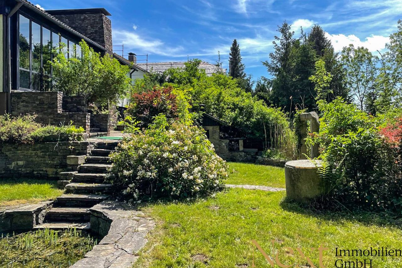 Ein echtes Highlight ist der lichtdurchflutete Wintergarten, der einen herrlichen Blick ins Grüne bietet und zum Verweilen einlädt. Der weitläufige Garten erweitert den Wohnraum ins Freie und bietet vielfältige Möglichkeiten zur Entspannung und Freizeitgestaltung. Der idyllische Teich verleiht dem Anwesen eine besondere Ruhe, während eine praktische Gartenhütte zusätzlichen Stauraum schafft.