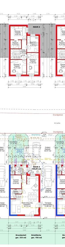 Grundstück und Außenbereich: Jedes Haus verfügt über eine Grundfläche zwischen 342 und 438 m², was Ihnen einen eigenen Garten von 154 bis 319 m² bietet. Zwei Stellplätze, ein gedeckter und ein freier, stehen Ihnen zur Verfügung.