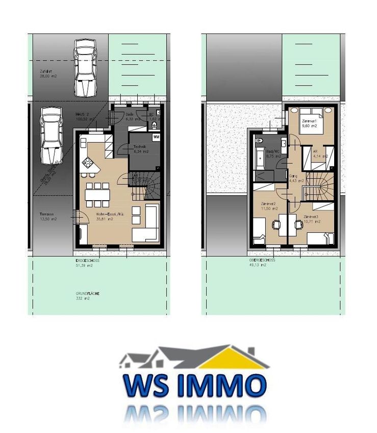 Die Gesamtwohnfläche je Haus beträgt 101,55 m2: im Erdgeschoß befindet sich ein offener Wohn-Essbereich mit Küche, außerdem Diele, WC, Technikraum und ein Abstellraum. Über die offene Treppe gelangt man im Obergeschoß zu drei Schlafräumen, davon einer mit angrenzendem Schrankraum, sowie zum Bad mit Toilette.