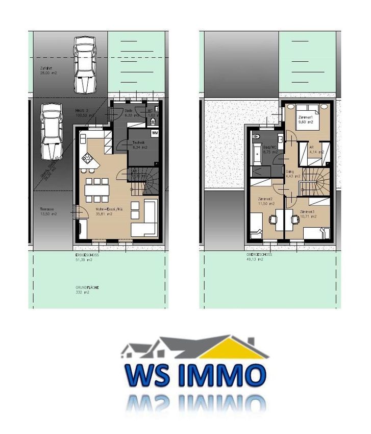 Die Gesamtwohnfläche je Haus beträgt 101,55 m2: im Erdgeschoß befindet sich ein offener Wohn-Essbereich mit Küche, außerdem Diele, WC, Technikraum und ein Abstellraum. Über die offene Treppe gelangt man im Obergeschoß zu drei Schlafräumen, davon einer mit angrenzendem Schrankraum, sowie zum Bad mit Toilette.