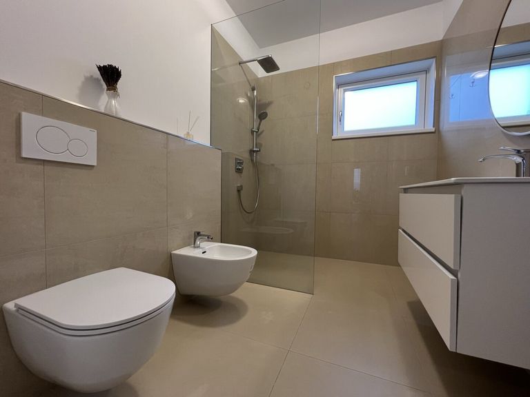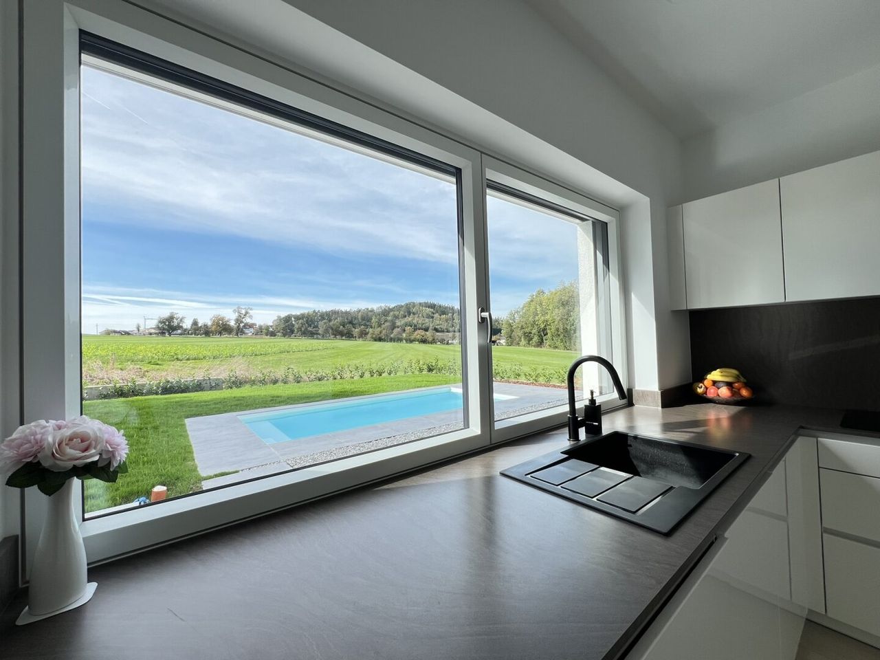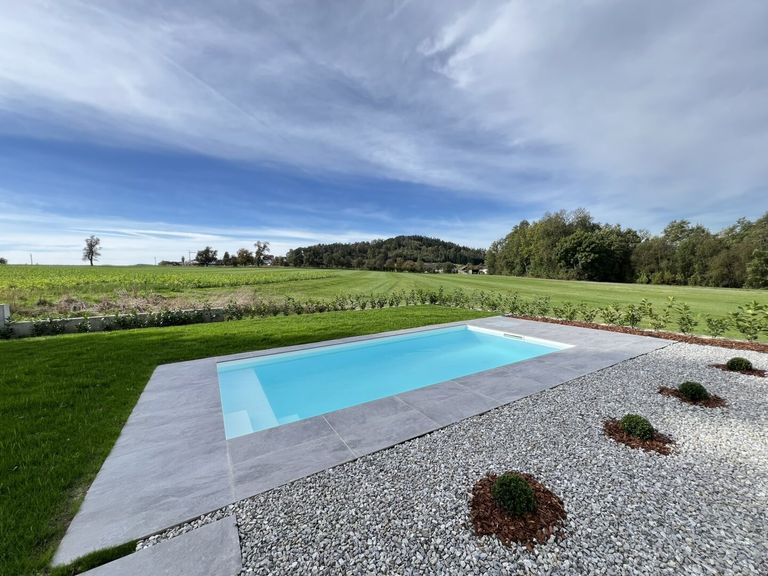 Besonders hervorzuheben sind die stilvollen Großformatfliesen, die hochwertigen Alu-Kunststofffenster sowie die edle Holz-Alu-Eingangstüre, die den exklusiven Charakter des Hauses unterstreichen. Der Garten bietet nicht nur einen herrlichen Fernblick, sondern auch einen Swimmingpool mit Salzanlage, der an heißen Sommertagen für eine willkommene Abkühlung sorgt. Weitere Highlights sind der integrierte Zentralstaubsauger und die Bewässerungsanlage für den Garten, die den Komfort im Alltag zusätzlich erhöhen. Die vorhandene Einbauküche sowie die Möblierung sind im Kaufpreis inkludiert, sodass Sie direkt einziehen und sich wohlfühlen können.