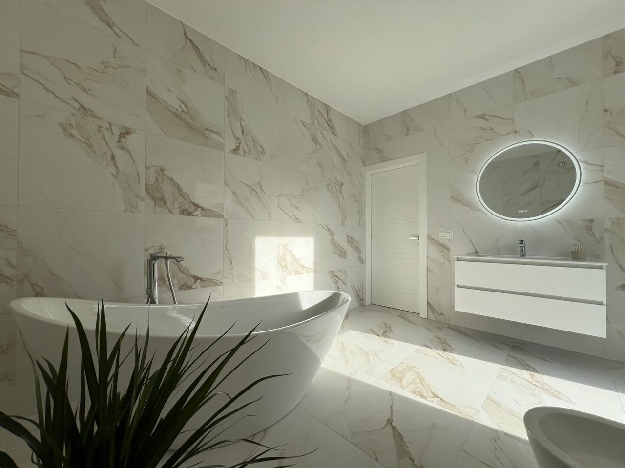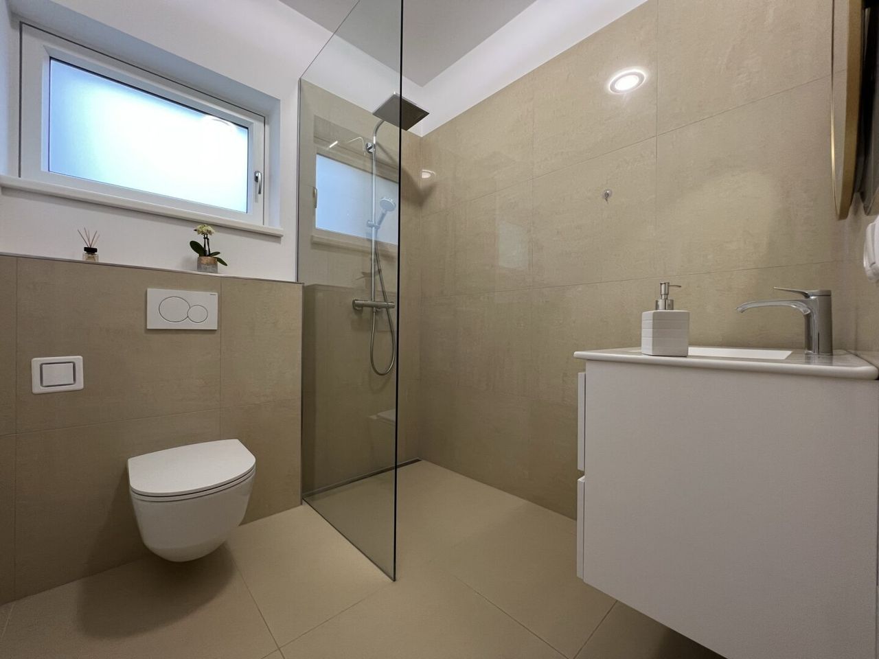 Angrenzend finden Sie ein weiteres Zimmer, das flexibel als Büro oder Gästezimmer genutzt werden kann, sowie ein stilvoll gestaltetes Badezimmer, das mit hochwertigen Materialien und modernem Design überzeugt. Für den Komfort im Alltag sorgt zudem die Doppelgarage, die genug Platz für zwei Fahrzeuge und Stauraum bietet.