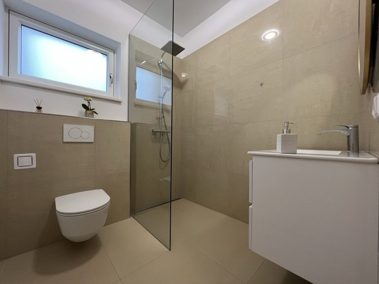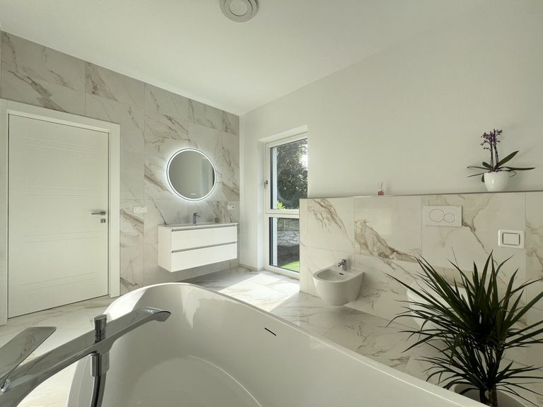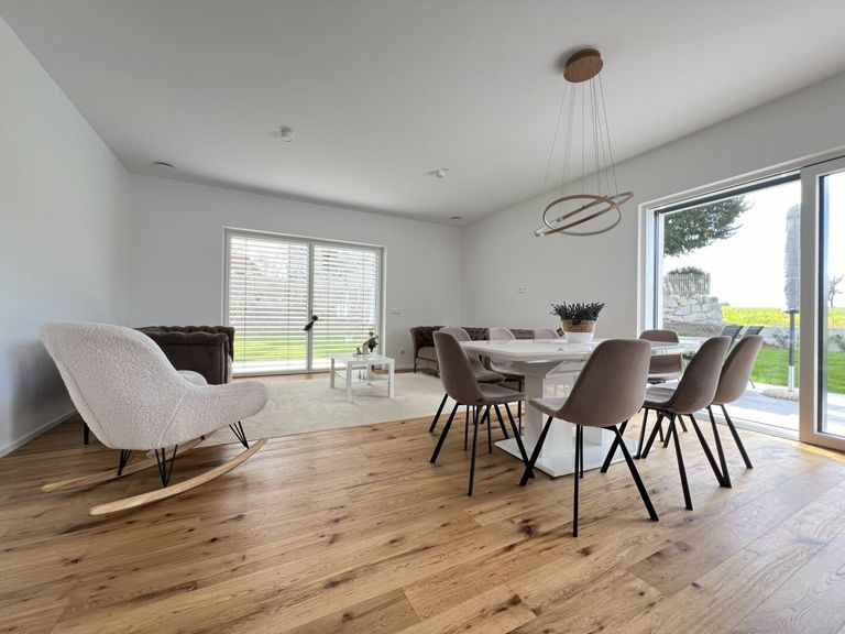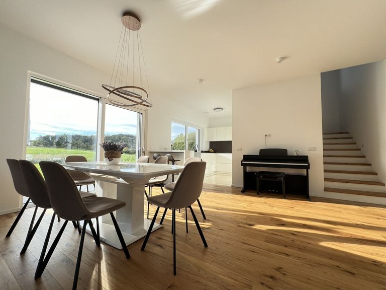 Bereits beim Betreten des großzügigen und einladenden Eingangsbereichs wird klar, dass hier mit viel Liebe zum Detail geplant und gearbeitet wurde. Das Erdgeschoss besticht durch einen offenen Wohn-, Koch- und Essbereich, der nahtlos ineinander übergeht und so eine lichtdurchflutete, harmonische Atmosphäre schafft. Hier können Sie den Alltag hinter sich lassen und in stilvollem Ambiente entspannen.
