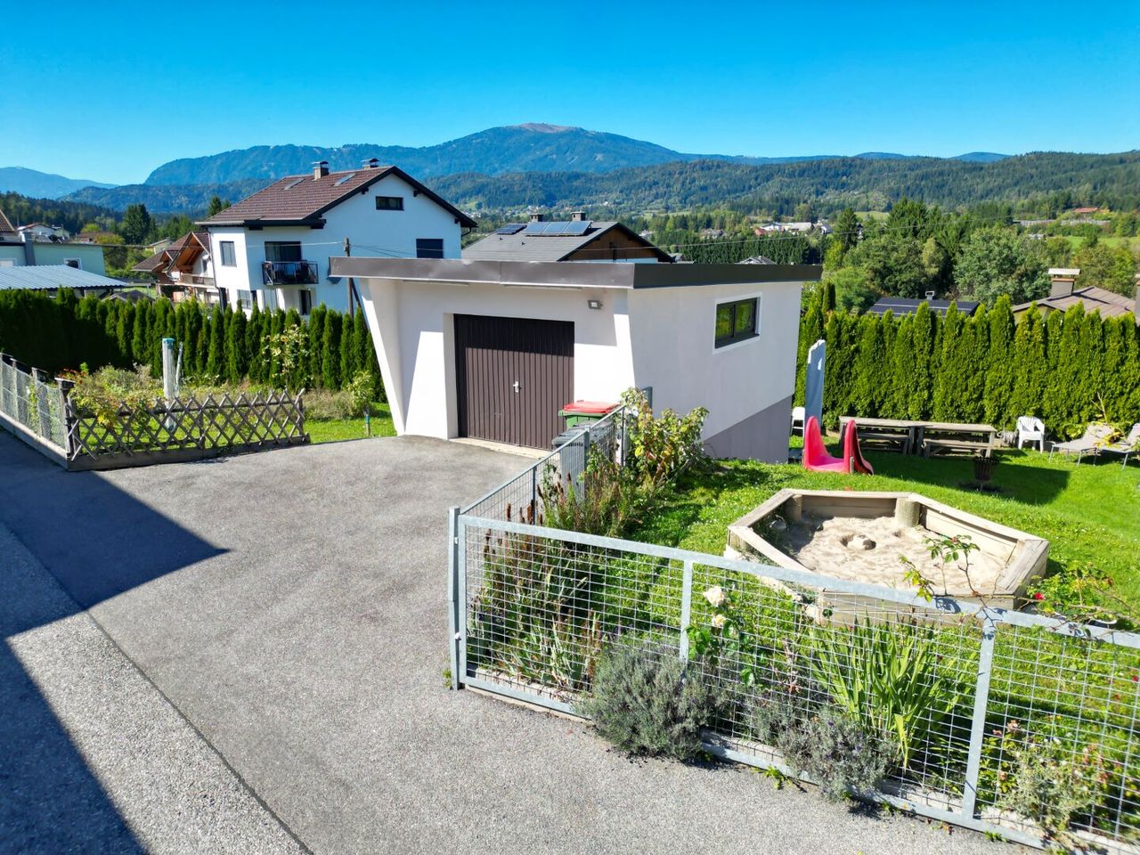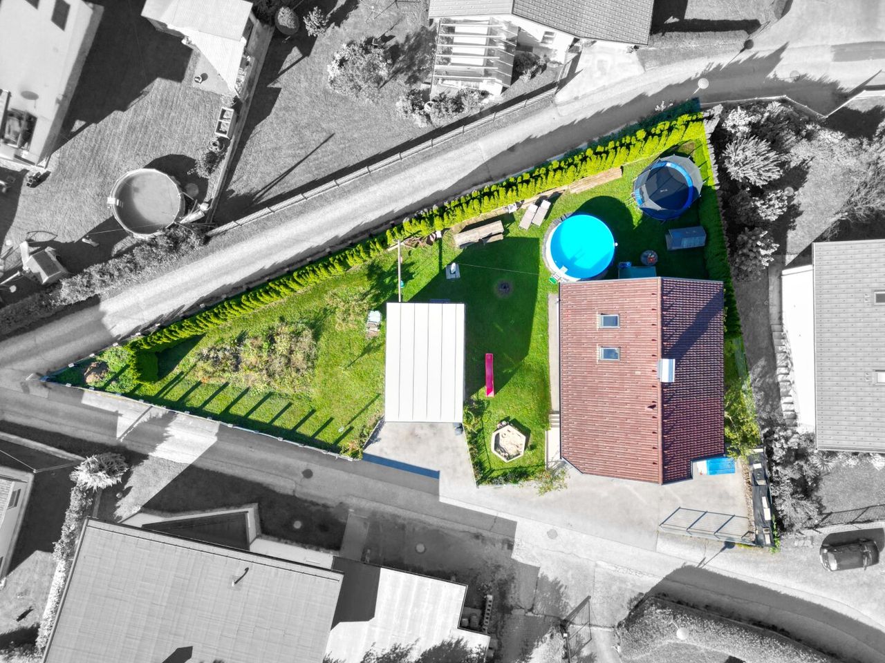 + insg. 824m² sonnige Grundstücksfläche mit schönem Garten, Pool und Kinder-Spielbereich