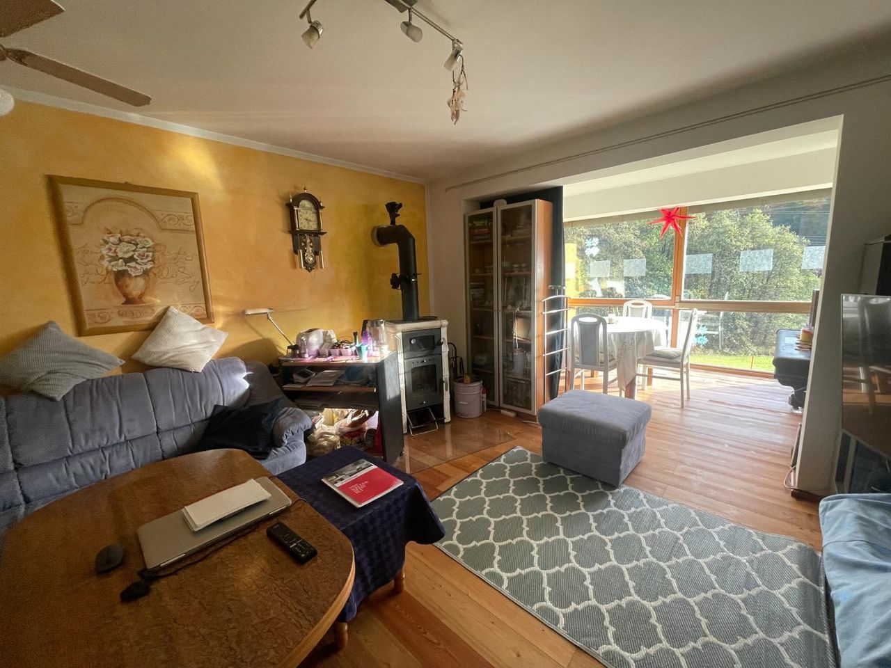 Im Erdgeschoß befindet sich die Küche mit Wohnraum, Zimmer und Bad, Ausgang in den Wintergarten.