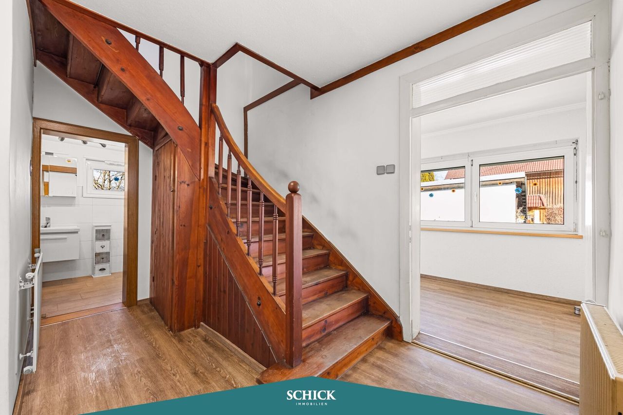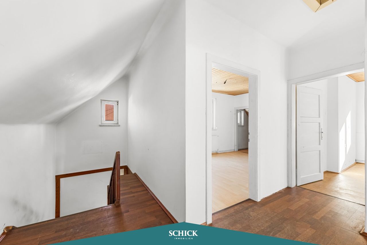 Im Obergeschoss erwarten Sie zwei helle Zimmer, ein Kabinett und ein begehbarer Kleiderschrank sowie ein fast 13 m² großer Balkon. Ein zusätzliches WC und eine Waschküche im Obergeschoss sind praktisch. Der Doppel-Carport schützt Ihre Fahrzeuge. Genießen Sie die ruhigen Stunden im eigenen Garten.