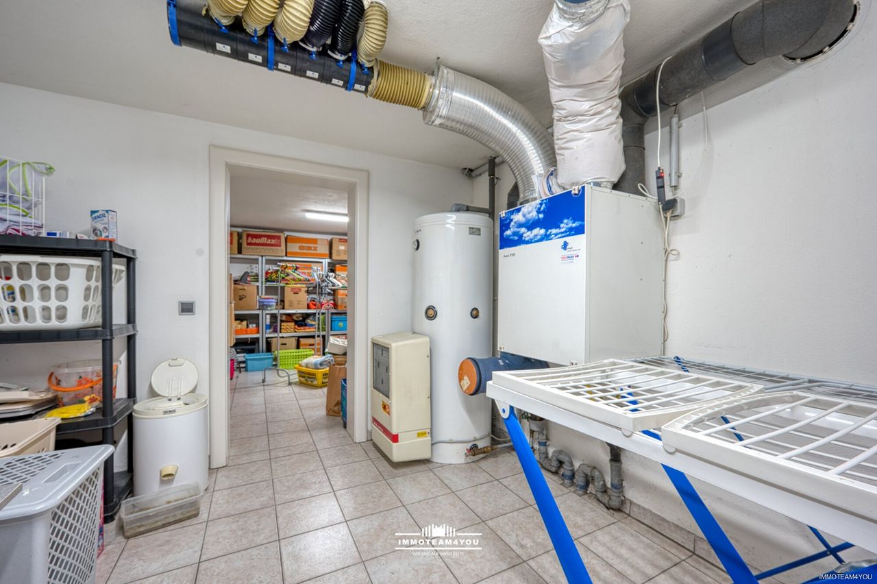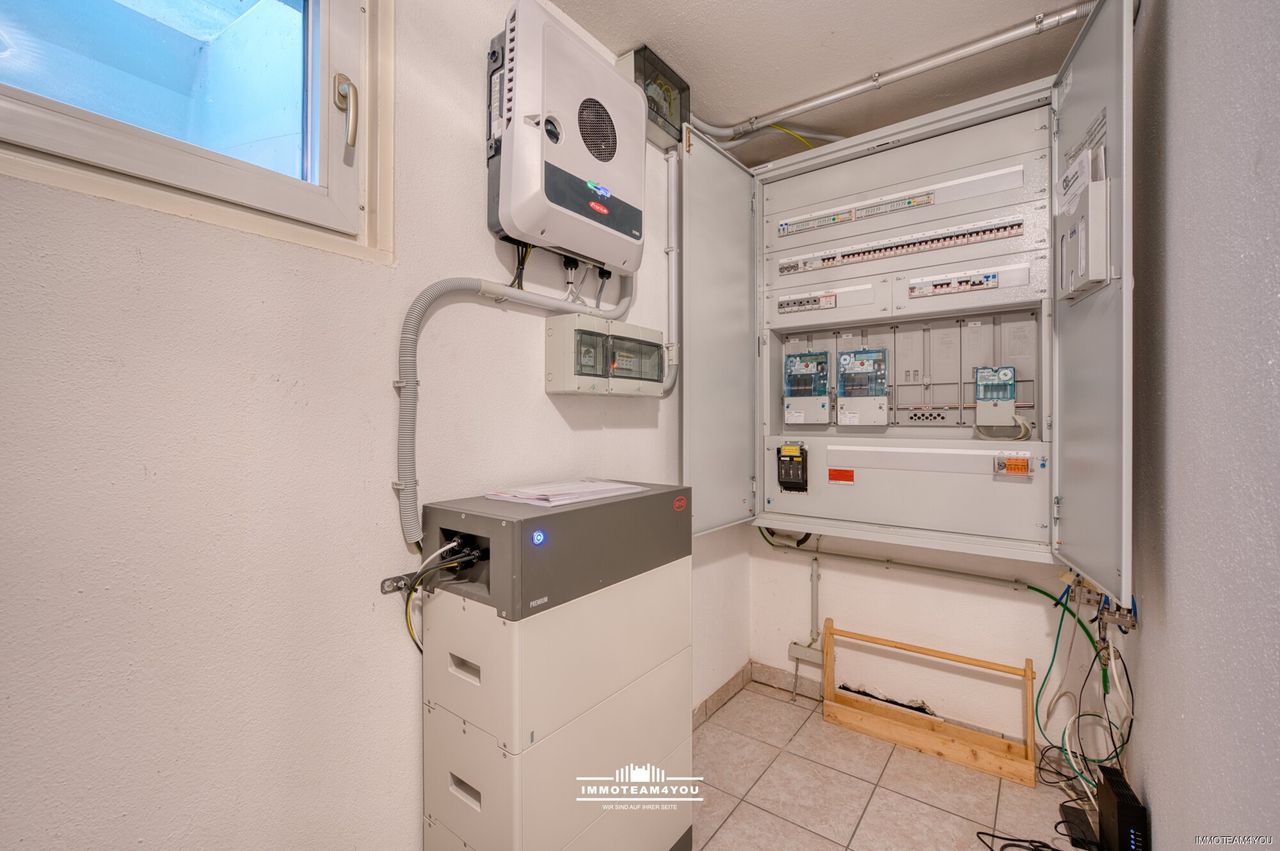 Der Keller ist voll ausgebaut und überzeugt mit einem hohen Nutzwert: Neben einem großen Abstell- und Technikraum finden sich hier zwei Gästezimmer, ein Bad mit WC, sowie sämtliche technischen Komponenten für Heizung, Lüftung und Photovoltaik.