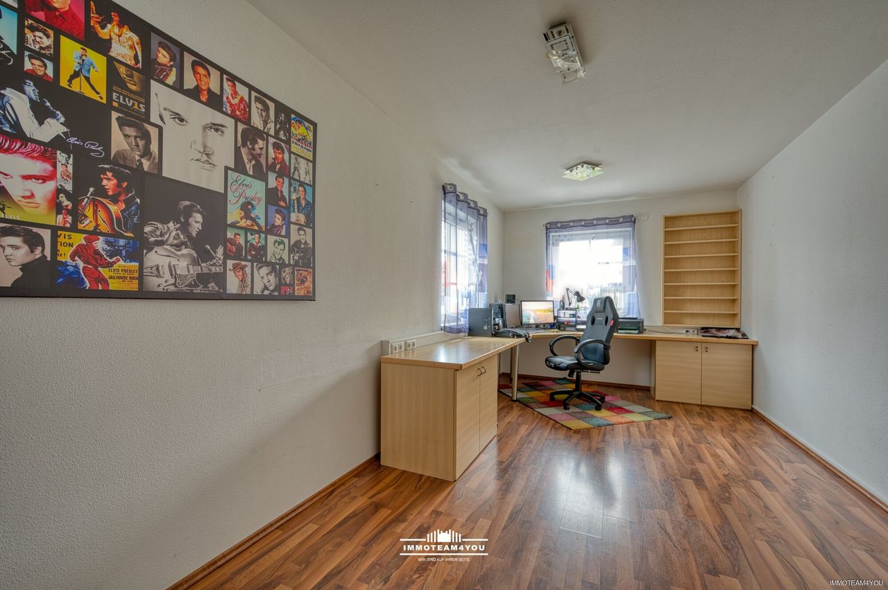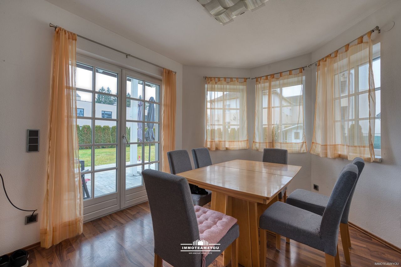 Bereits beim Betreten spürt man die Großzügigkeit: Der helle Vorraum mit Garderobe führt in den offenen Wohn- und Essbereich mit maßgefertigter Küche von Möbel Lutz, die samt Geräten im Haus verbleibt. Große Fensterflächen sorgen für ein lichtdurchflutetes Ambiente und schaffen fließende Übergänge zur Terrasse und in den Garten. Ein weiteres Zimmer im Erdgeschoss bietet flexible Nutzungsmöglichkeiten – als Büro, Gäste- oder Hobbyraum.