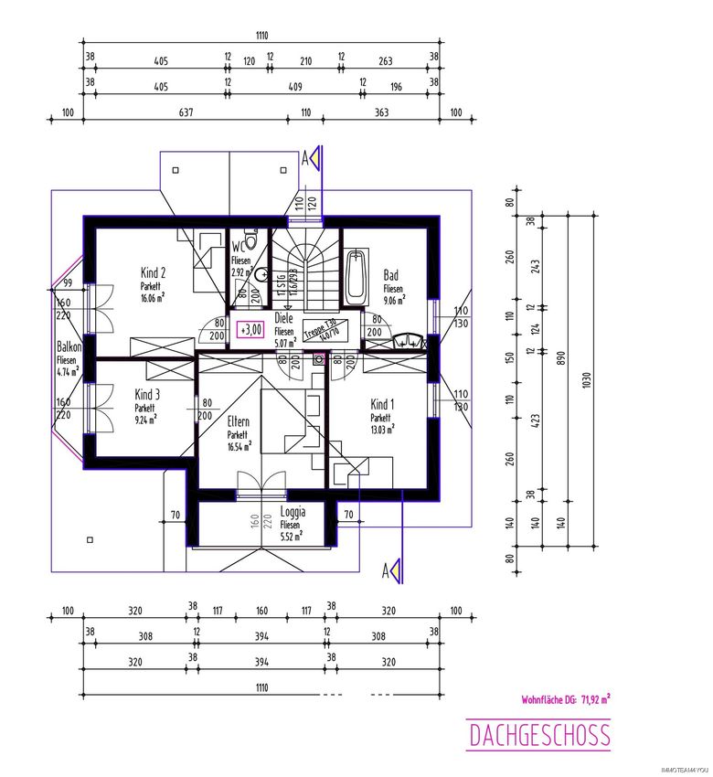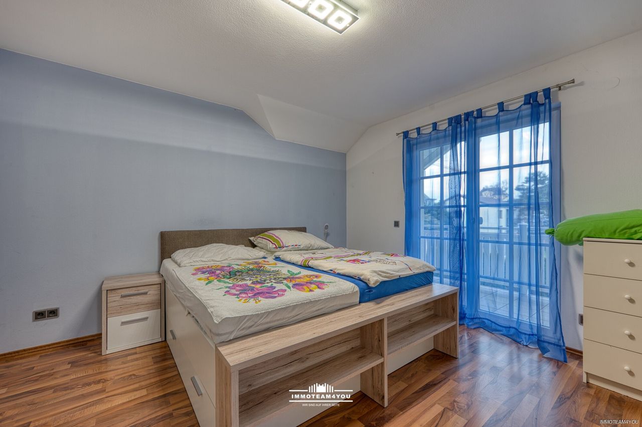 Im Obergeschoss erwarten Sie ein geräumiges Schlafzimmer mit Loggia, angrenzendem Schrankraum und Balkonzugang, ein weiteres großes Zimmer mit Balkon, ein Kinderzimmer sowie ein modernes Bad mit Wandheizung und separates WC.