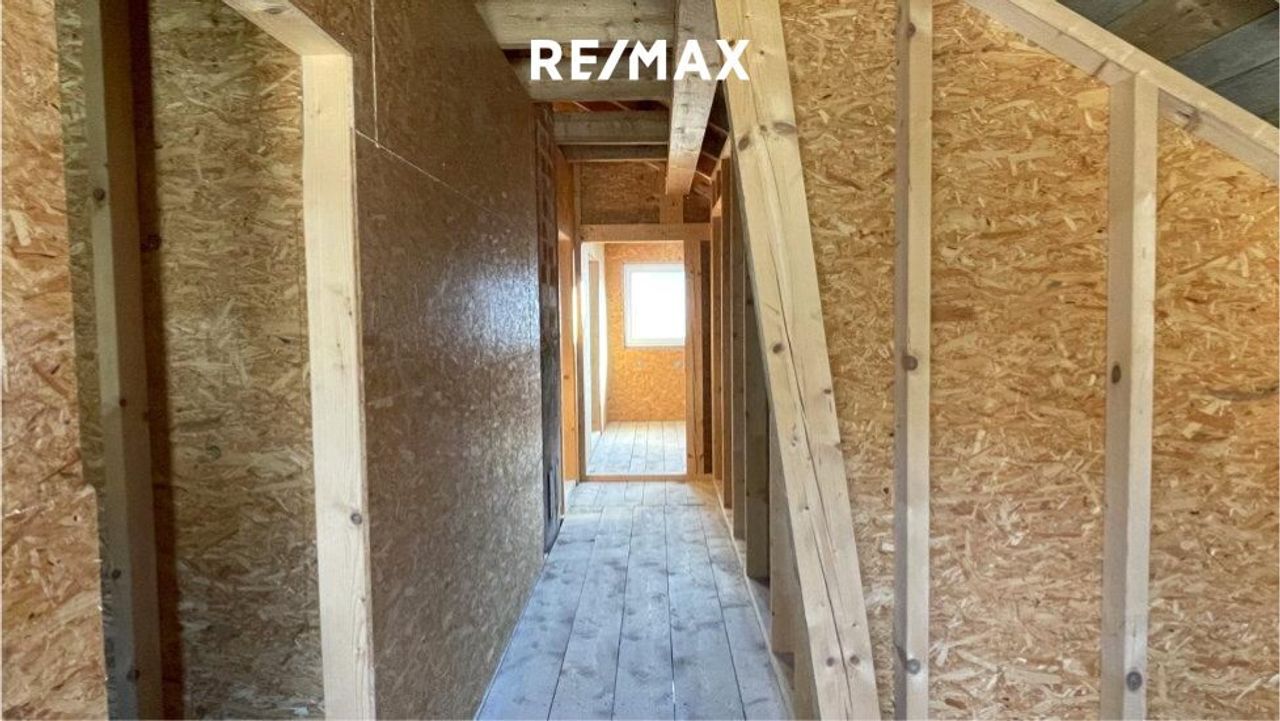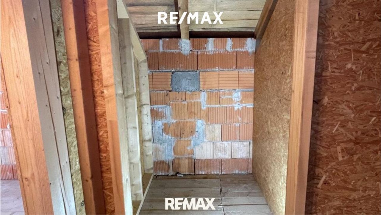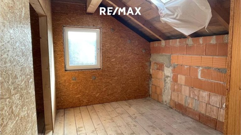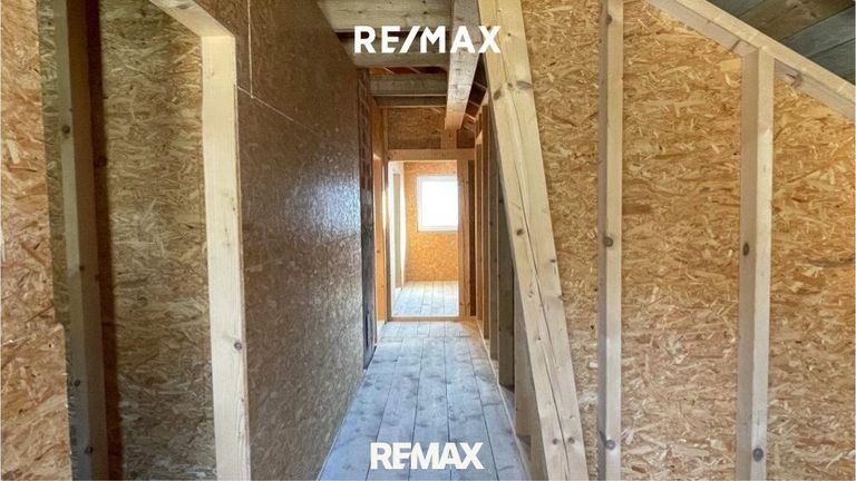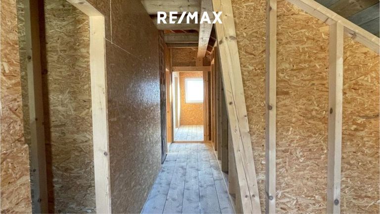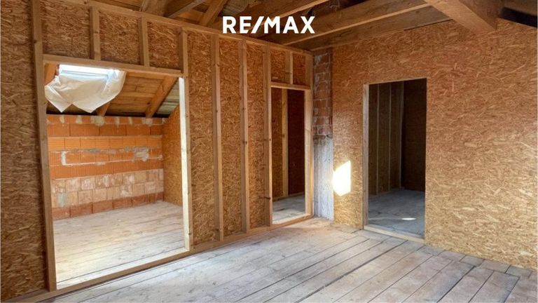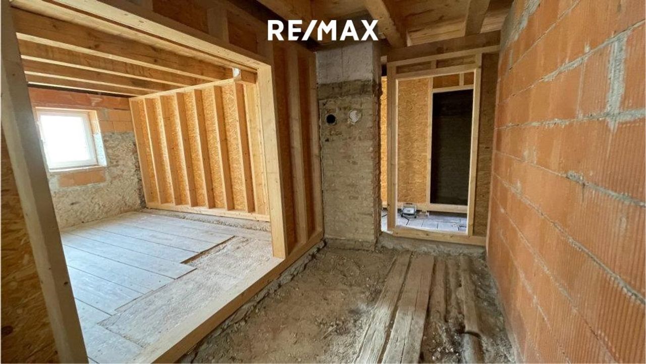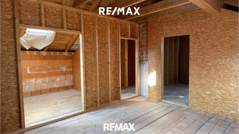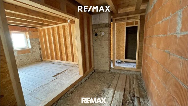 Küche, Wohnzimmer, 2 Schlafzimmer, WC, Bad und Vorraum. Das Dachgeschoß befindet sich im Rohbaustadium.