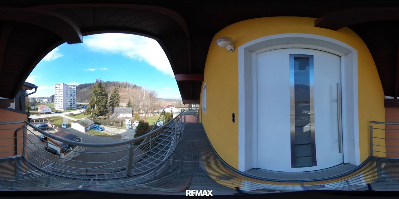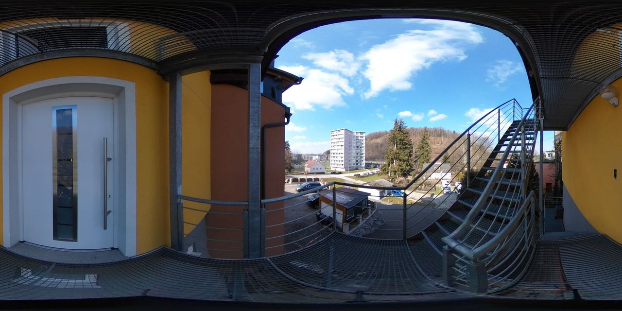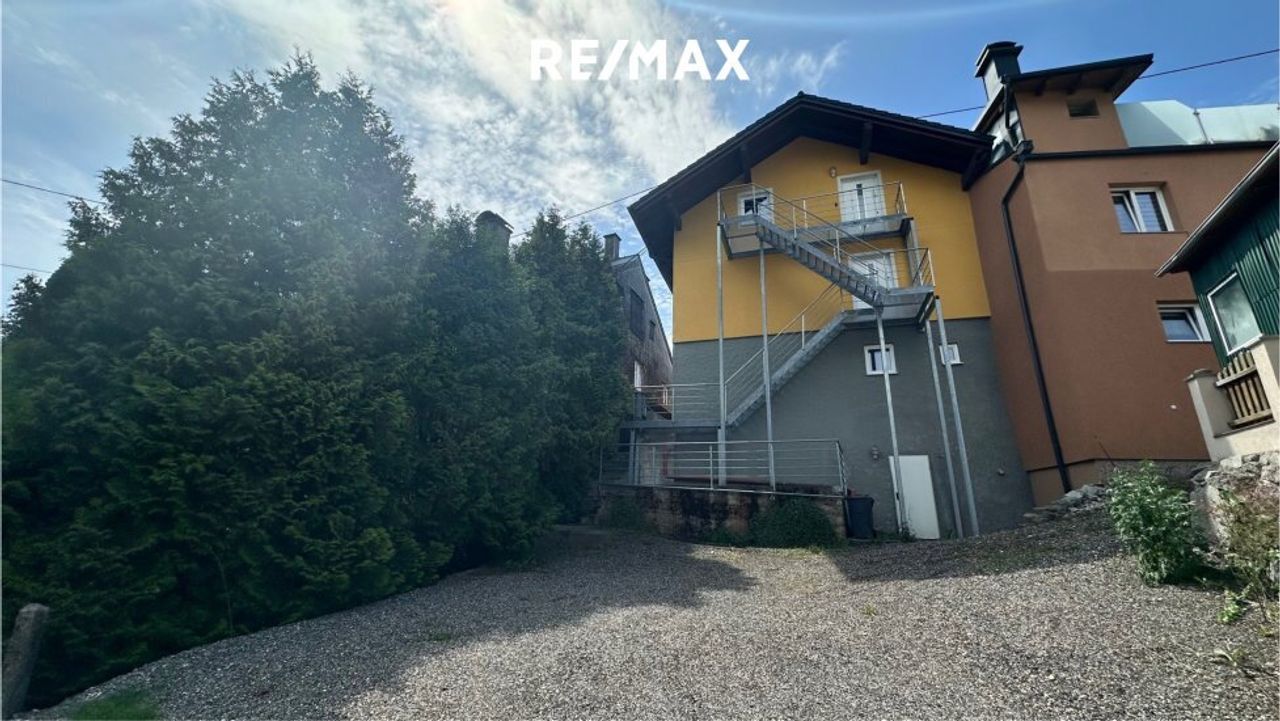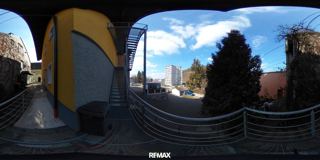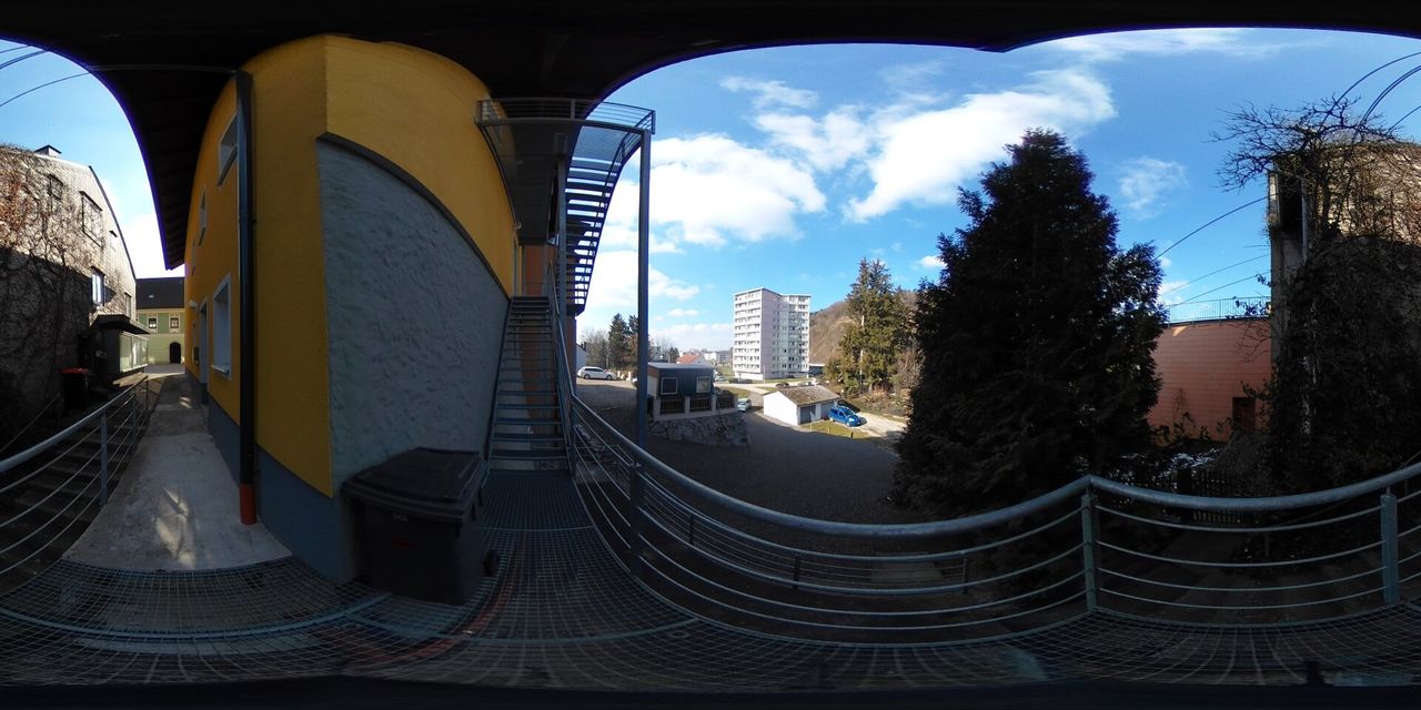 Die Wohnung im 1. Stockwerk und die Dachgeschoßwohnung sind jeweils über eine Stahltreppe vom Außenbereich erreichbar.