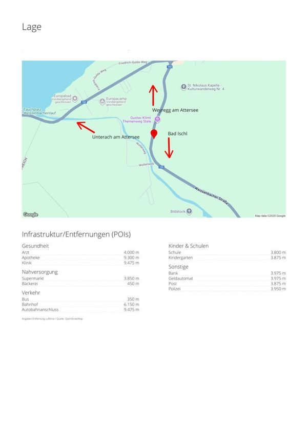 Das Objekt befindet sich in einem als Mischgebiet gewidmeten Bereich an der Verbindungsstraße vom Attersee in Richtung Inneres Salzkammergut (Bad Ischl, Bad Aussee) und überzeugt durch seine gut erreichbare Lage sowie die unmittelbare Nähe zum Attersee und zu den umliegenden Bergen.