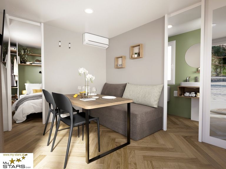 Das Mobilheim hat auch eine Klimaanlage, die kühlt und heizt. Wasser, Kanal, Strom, WLAN und Koaxialkabel für den TV Anschluß sind vorhanden.