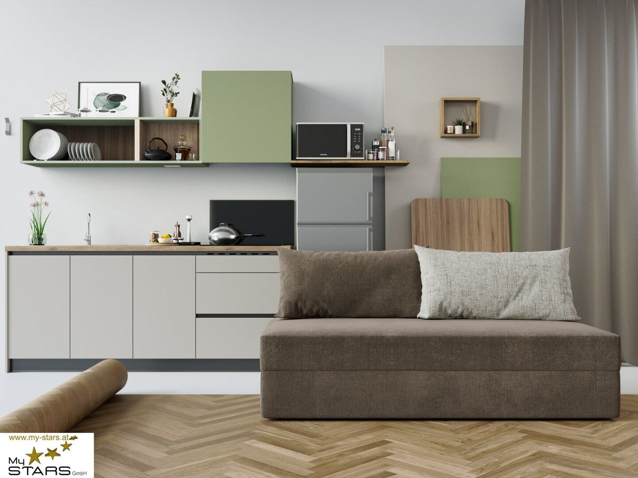 Die moderne Einbauküche, ausgestattet mit hochwertigen Geräten, lädt zum Kochen und Verweilen ein. Der Wohnbereich ist mit robustem Kunststofffußboden ausgelegt, was für eine angenehme Atmosphäre sorgt.