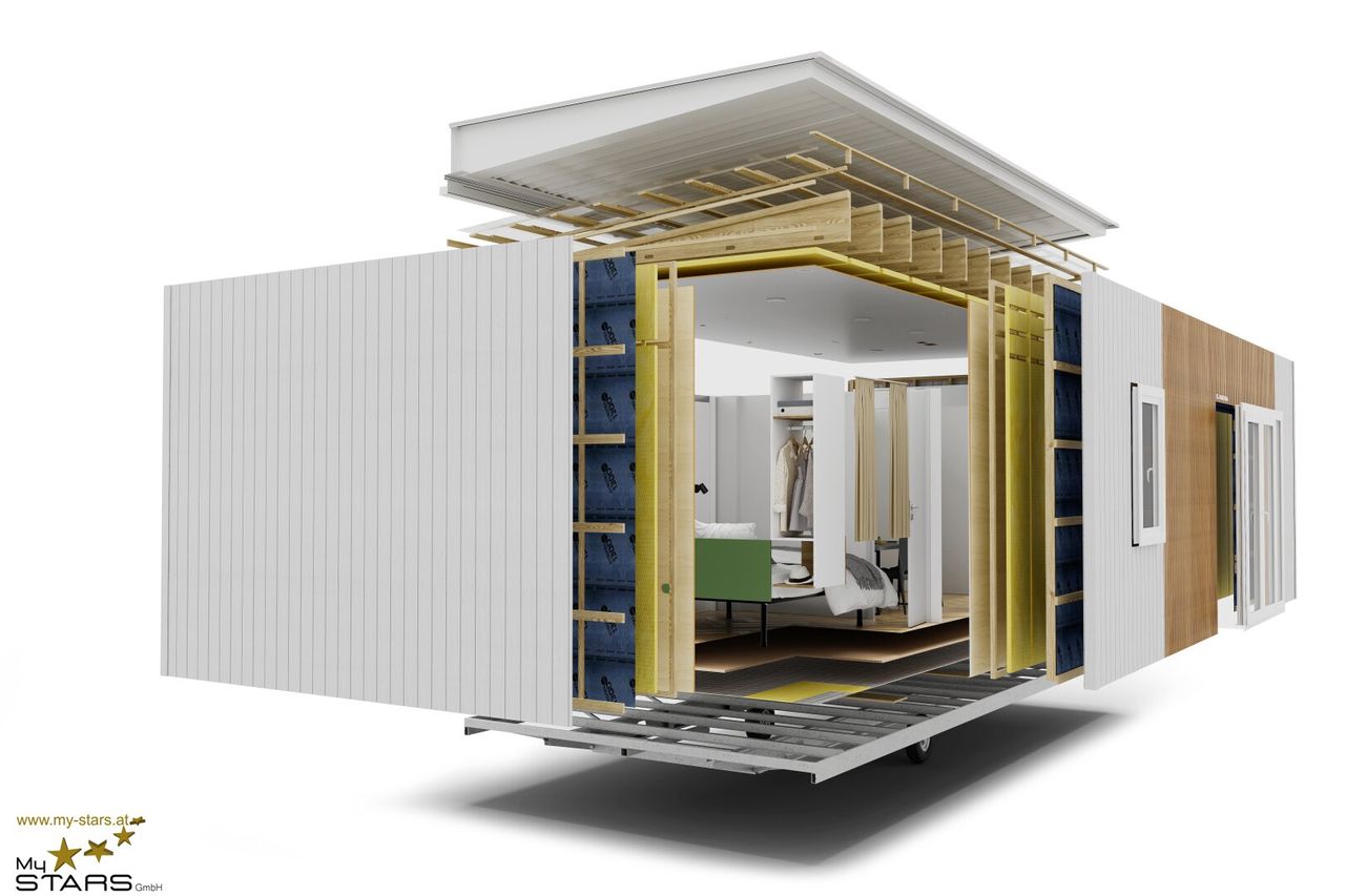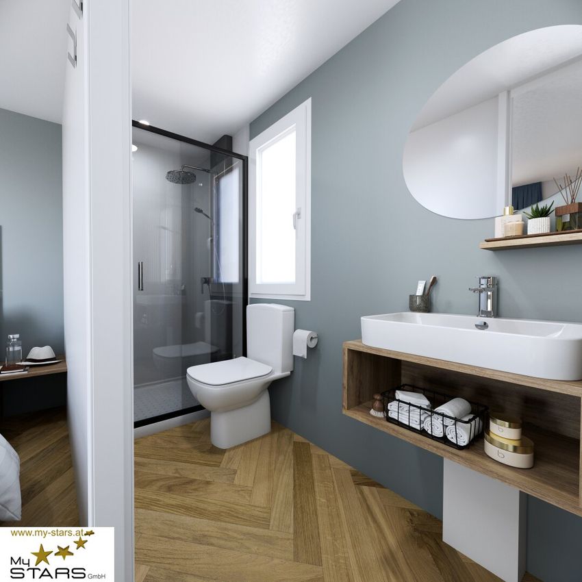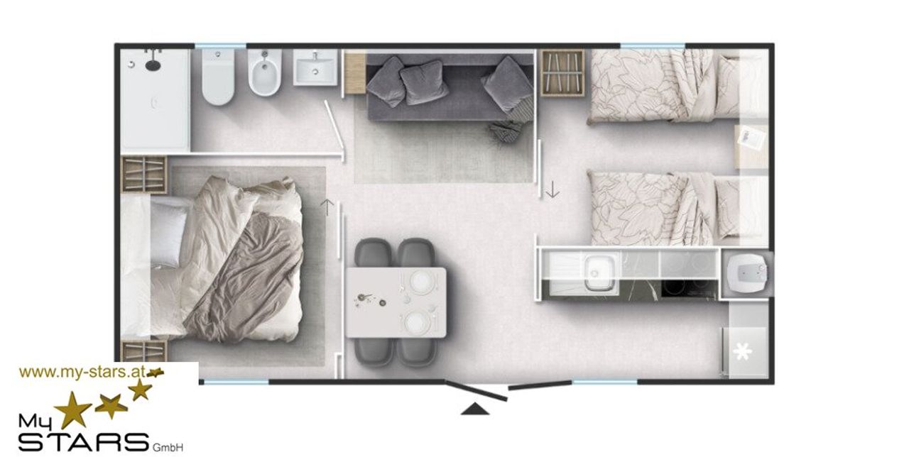 Zur Auswahl stehen verschiedene Mobilheim-Haus-Typen (bitte Detailunterlagen anfragen), z.B. das Modell: "M-Line Pure 754 Basic".