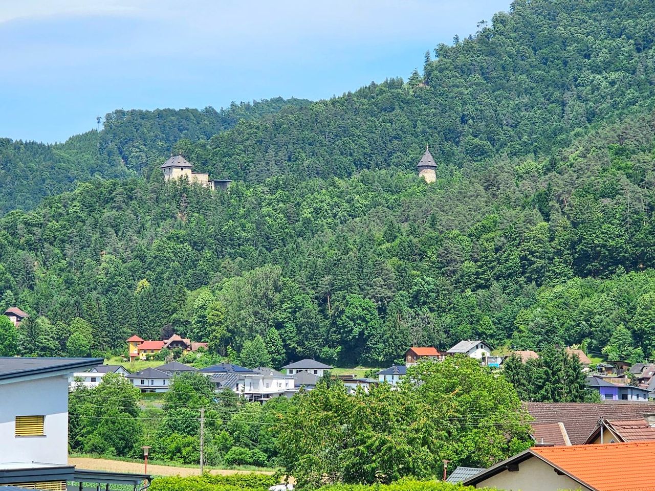 * wunderbarer Blick auf die Petzen und auf die Burg Weißenegg, sowie auf die Kirche am Lisnaberg und die Kirche im Ort