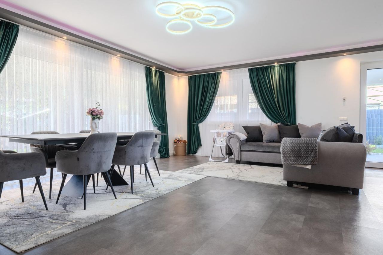 Dieses moderne Einfamilienhaus überzeugt durch klare Linien, hochwertige Materialien und ein durchdachtes Raumkonzept. Mit einer Wohnfläche von ca. 178,9 m², verteilt auf Erd- und Obergeschoss, eignet sich das Hausideal für Familien, die Wert auf Komfort, Qualität und ein stilvolles Wohnambiente legen. Bereits beim Betreten des Hauses wird deutlich, dass hier viel Wert auf eine helle, offene Gestaltung gelegt wurde. Der offene Wohn-und Essbereich bildet das Herzstück des Hauses. Großzügige Fensterfronten sorgen für lichtdurchflutete Räume und einen direkten Zugang zu den beiden Terrassen, die gemeinsam ca. 73,49 m² umfassen. Das Haus verfügt über insgesamt 5 Schlafzimmer, die vielseitig nutzbar sind – ob als Kinderzimmer, Home-Office oder Gästezimmer. Ergänzt wird das Raumangebot durch 2 moderne Badezimmer, jeweils hochwertig ausgestattet, sowie 2 praktische Abstellräume, die wertvolle zusätzliche Staufläche bieten.