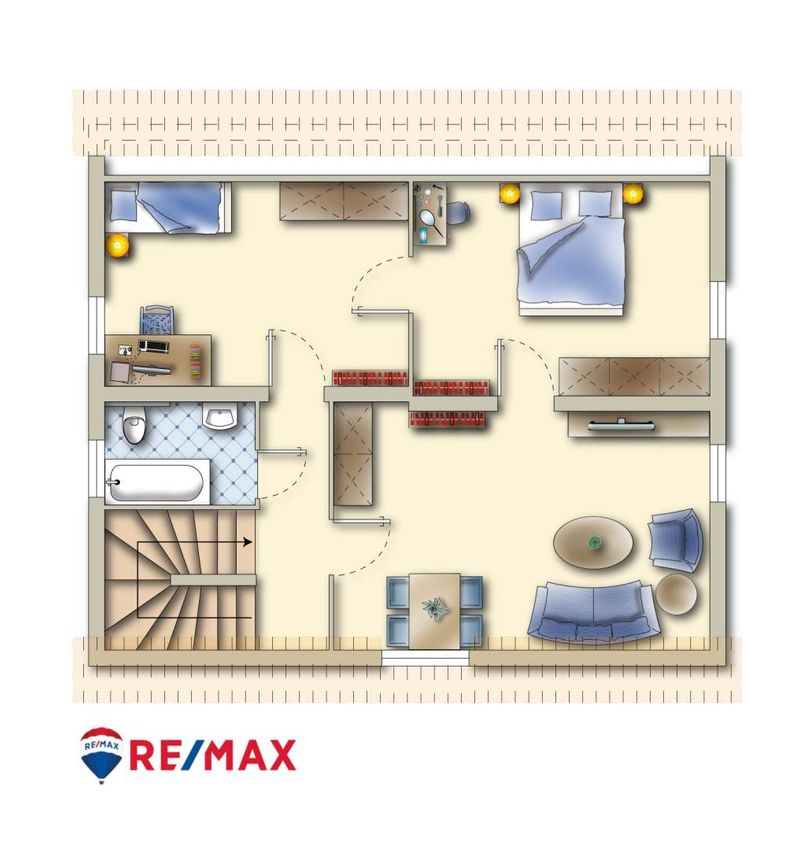 Das Obergeschoss teilt sich wie folgt auf: