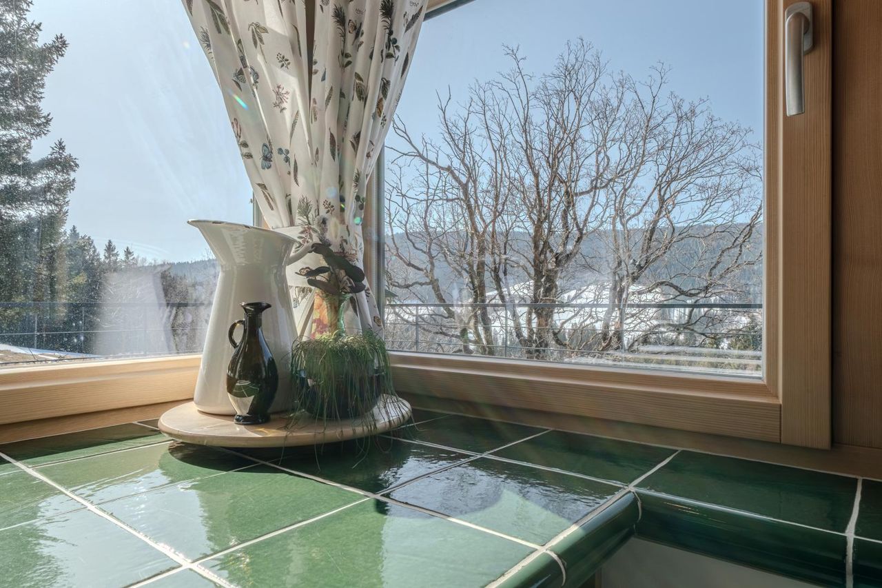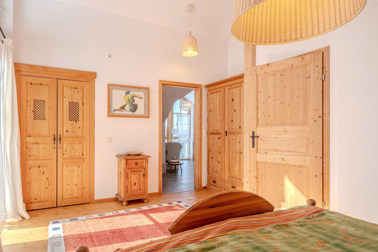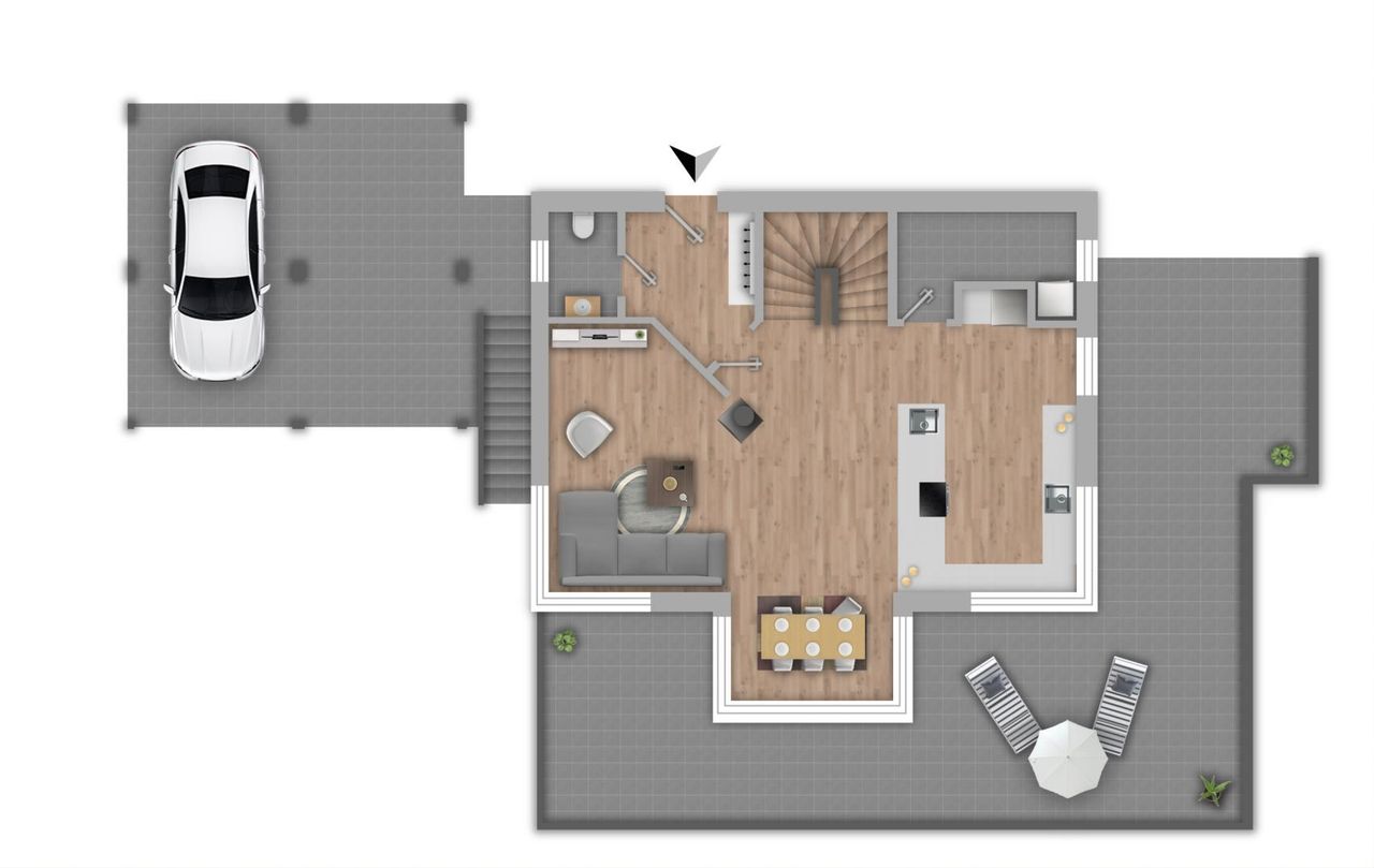 Ein besonderes Highlight stellen die großzügigen Außenbereiche dar. Die etwa 50 m² große Terrasse im Erdgeschoss bietet einen schönen Blick in die umliegende Landschaft und überdacht gleichzeitig die darunterliegende Terrasse im Kellergeschoss mit rund 45 m². Beide Terrassen sowie der Hofbereich wurden mit Hartgneis-Naturstein gepflastert und verleihen dem Außenbereich eine besonders elegante Gestaltung.