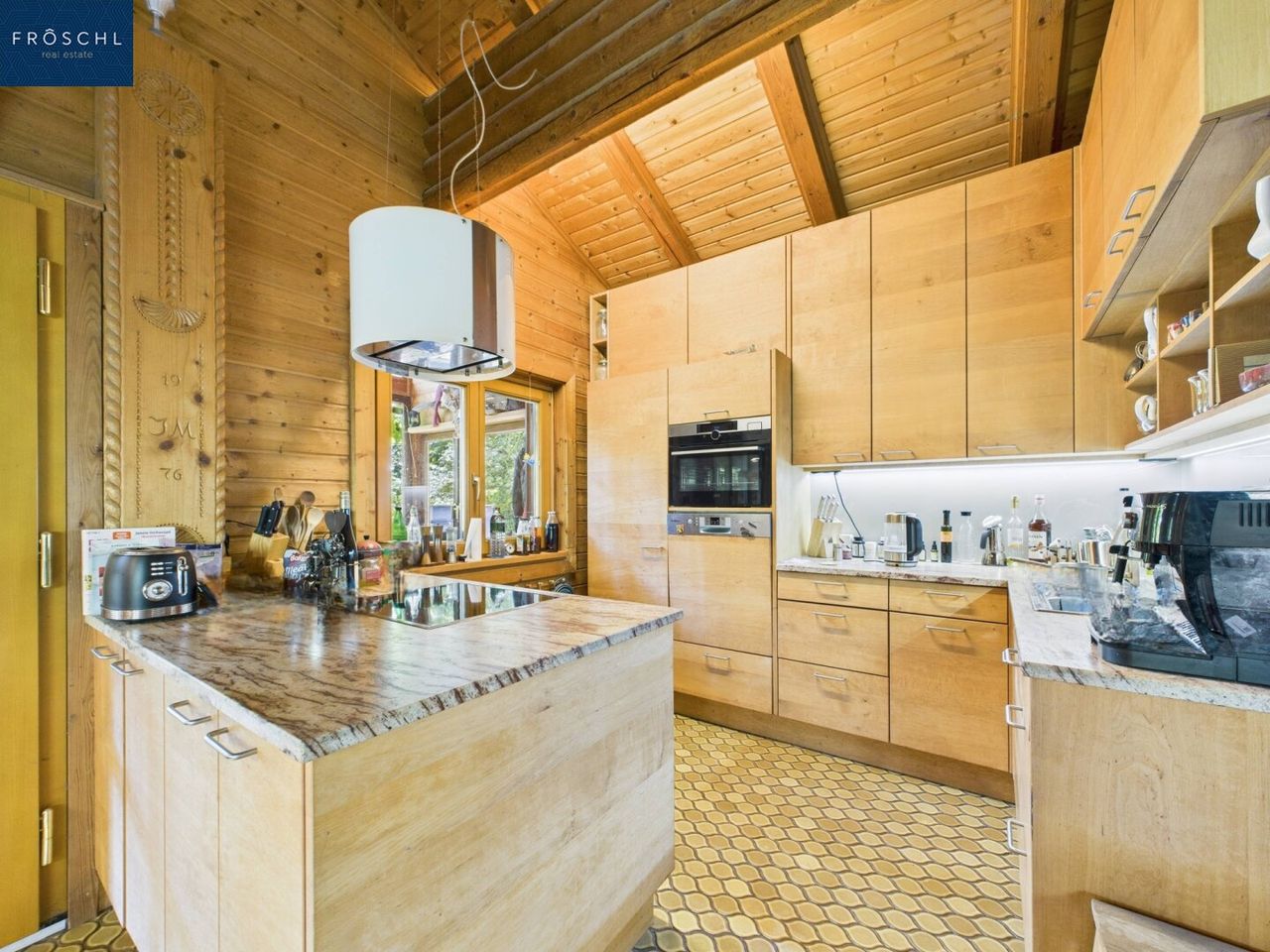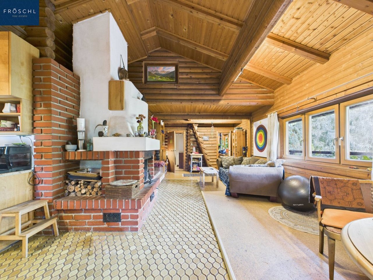 Holzbohlenhaus mit etwa 165 m² Wohnfläche auf drei Ebenen: Charaktervoll, warm und authentisch, mit Balkon und überdachter Terrasse als natürliche Erweiterung in den Garten. Die Beheizung erfolgt über Kachelofen, offenen Kamin und Infrarotpaneele. Eine Sauna mit Holzofen schafft einen zusätzlichen Rückzugsort. Die Küche ist als Vollholzküche aus Erle ausgeführt und mit Dampfgarer, Miele-Kühlschrank und Geschirrspüler ausgestattet.