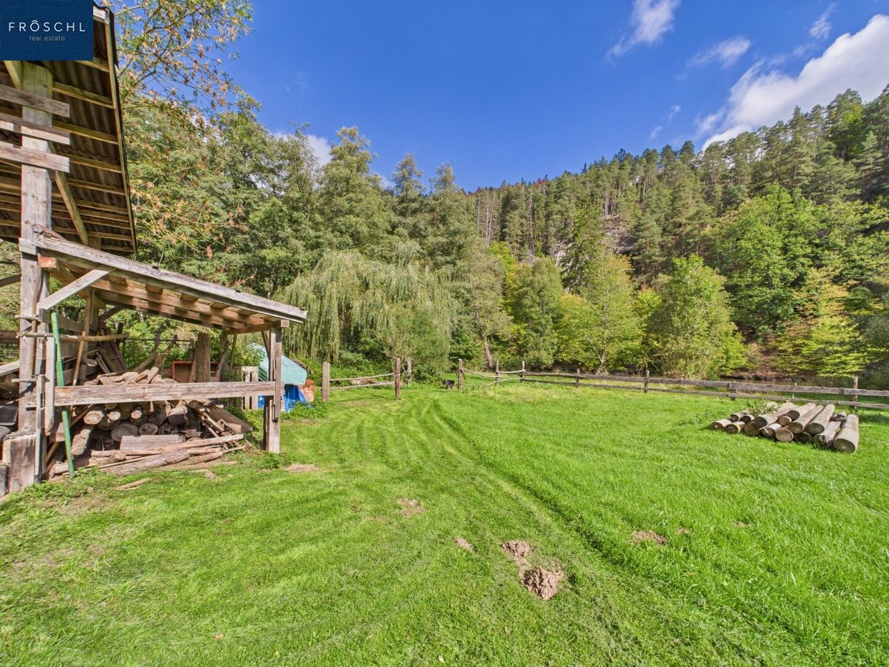 Am Rand des Nationalparks Thayatal, dort wo die Landschaft leise wird und die Thaya in ruhigen Schleifen vorbeizieht, liegt dieses besondere Ensemble. Ein erhaltenswertes Holzbohlenhaus mit drei Ebenen, flankiert von Garage, großzügigem Pferdestall und stimmigen Nebengebäuden – eingebettet in ein rund 3.510 m² großes Naturgrundstück mit direktem Wasserzugang. Zusätzlich erweitert ein Pachtgrundstück von ca. 1 Hektar direkt am Fluss den privaten Freiraum – mit eigenem Kanuanleger und Badeplatz für die stillen Momente am Wasser. Errichtet 1976, umfassend adaptiert 2001–2009.