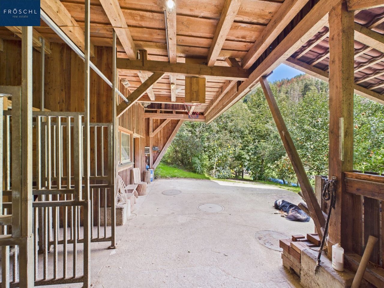 Der Pferdestall verfügt über zwei Ebenen mit insgesamt 170 m² und eignet sich sowohl als Stallfläche als auch als Atelier, Werkstatt oder Lagerbereich. Weitere Nebengebäude ergänzen das Gesamtbild. Brennholz ist vor Ort vorhanden.