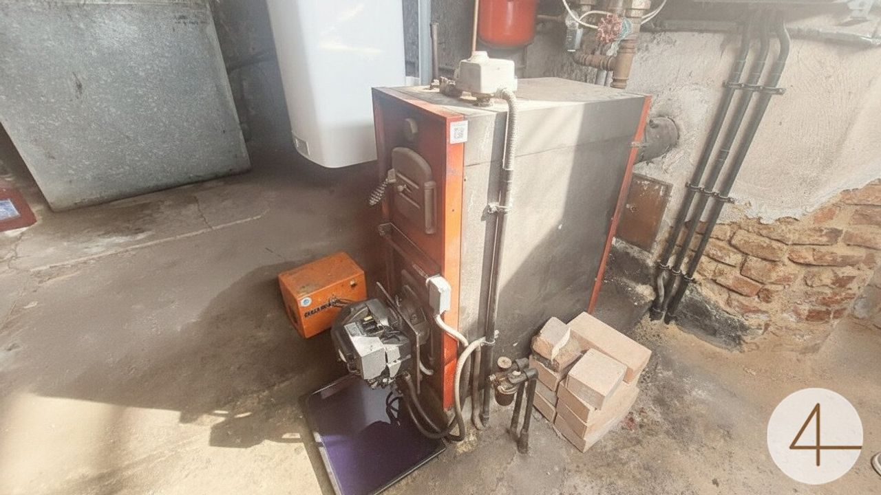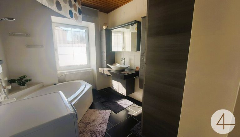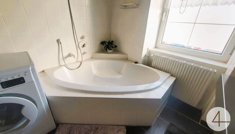 Badezimmer mit Eckbadewanne, Kellerraum mit Zentralheizungsofen;