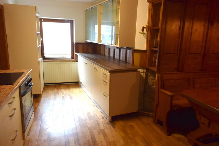 Vorraum, Küche mit Essecke, großzügiges Wohnzimmer mit alter Holzdecke, 3 Schlafräume, Bad (Dusche und Wanne, WC, Bidet), WC.